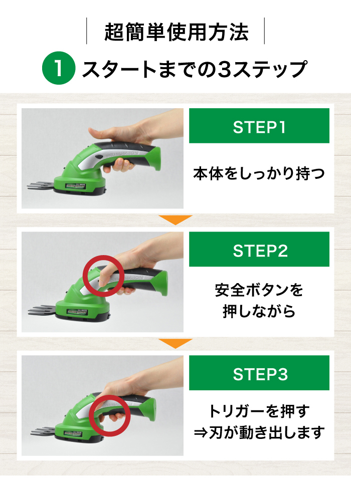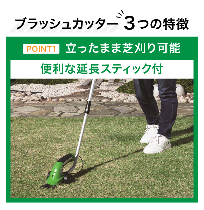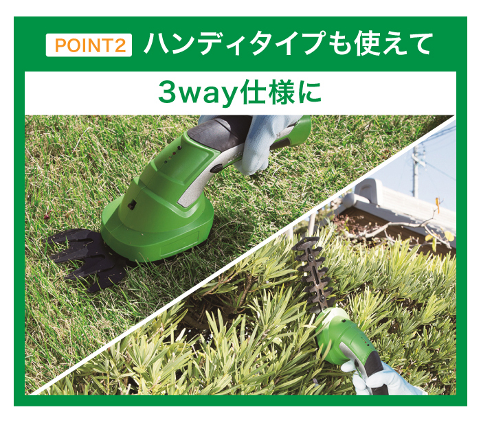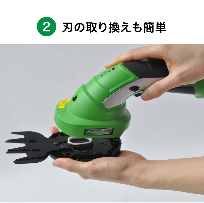 ■バリカン刃で芝生のきわ刈りや雑草の刈込が可能で、先端のアタッチメントをトリマーブレードに替えれば庭木のお手入れも手軽に行えます。