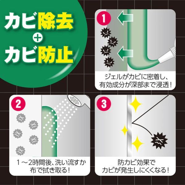 超強力密着ジェルがカビの奥まで浸透しガンコなカビ汚れを落とし防カビ効果が約2カ月持続します ジェルタイプなのでしっかり密着し有効成分が奥まで浸透しカビを効果的に除去 塩素系カビ取り剤にある特有のツンとしたニオイが少ない ジェルタイプなので飛び散らず目線より高い所や浴室以外の窓枠にも使いやすい 色つきジェルで分かりやすいのでつけ忘れ流し忘れなし カビの発生を抑制する防カビ剤を配合 ※防カビ効果:家庭用カビ抵抗性試験方法及びUYEKI社試験方法による ※酸性タイプの製品と一緒に混ぜないでください有害な塩素ガスが出て危険です 【商品詳細】 個装サイズ:70mmX225mmX50mm 個装重量:約348g 内容量:300g 液性:アルカリ性 成分:次亜塩素酸塩、水酸化カリウム(1.0%)、界面活性剤(アルキルアミンオキシド)、ゲル化剤、安定化剤 使用量の目安:1メートル当り5g 製造国:日本 発売元:株式会社UYEKI JANコード:4968909059993 |