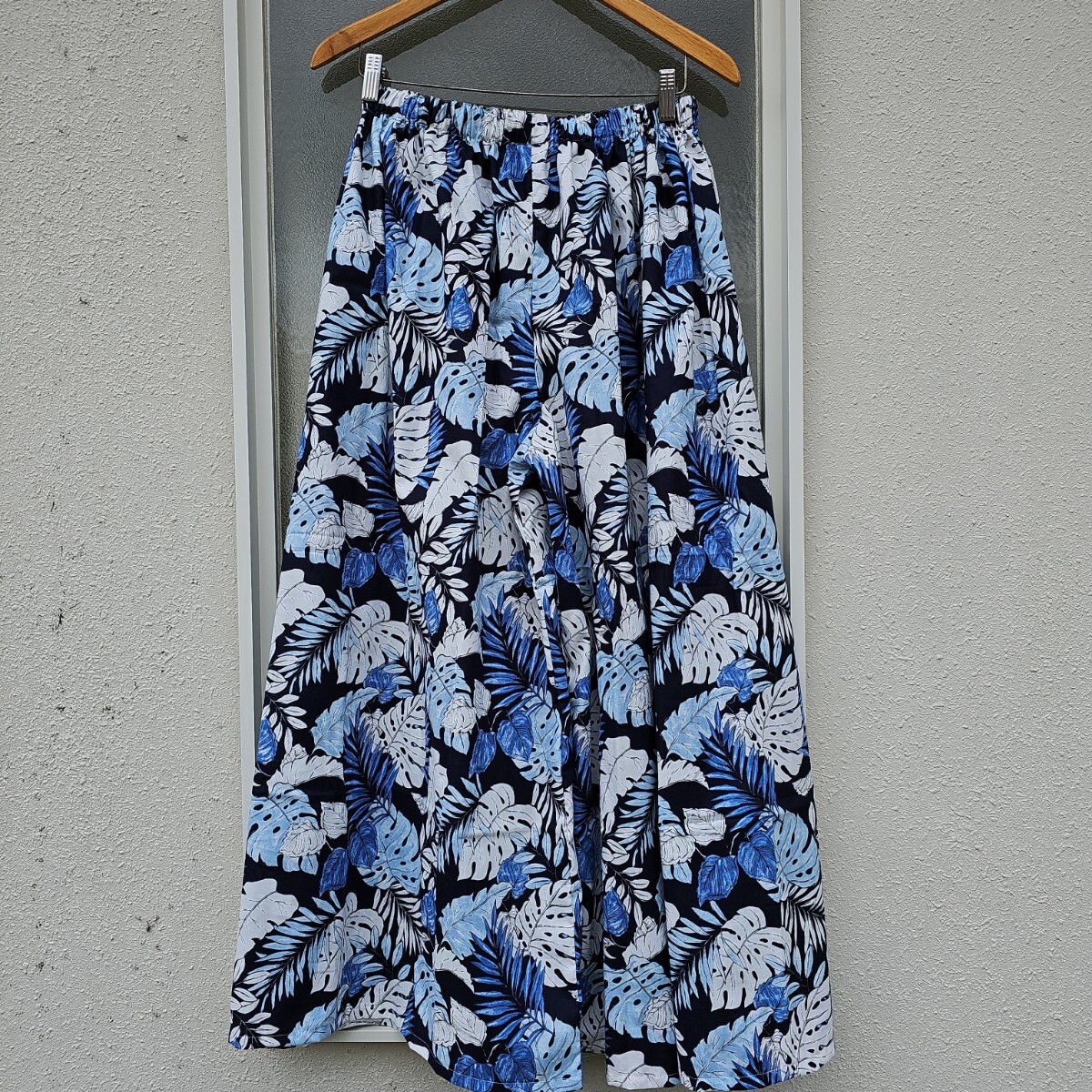 出来上がりサイズは平置きで、ウエスト(総ゴム)45cm、ヒップ108cm、裾幅54cm、総丈(ゴム部含めて)98cm、股上40cmです。