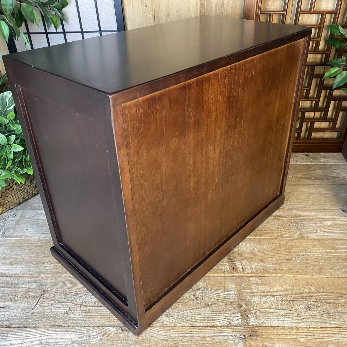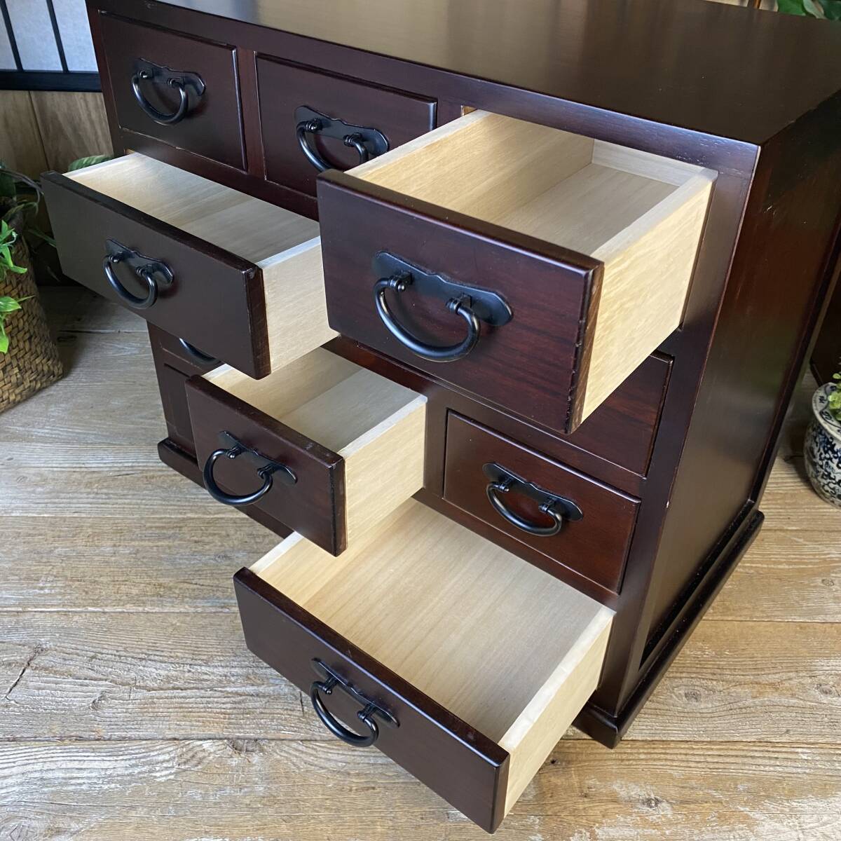 ◆◇商品詳細◇◆ 民芸家具多引き出しタンス 民芸調和多引き出しタンスチェストです。古き良き和の心、深みのあるお色が素敵な品です!お部屋のインテリアやショップのディスプレイ、和室にも合わせやすいですよ!小ぶりなタンスですが、引き出しが多く、小物をたくさん収納できます。アパート小部屋、施設ルーム、寮部屋などに最適なサイズ感です。和室や、アジアンテイストインテリアに良く合うお品です。天板が広く、飾り台やテレビ台などにもアレンジできそうですね! 【商品状態説明】 小キズあり、まずまずの美品。 完成品になります。 ※こちらの商品は、現品画像ではありません。製造段階や輸入段階での小キズ等で検品落ちしたB級アウトレット品の中から順番に発送しております。ほとんど気にならない程度の小キズになり、使用には全く問題はございませんが、気になる場合はご遠慮ください。他に『美品』記載の商品がありますのでそちらをご検討ください。 【サイズ】 横幅:60cm(下部土台含む横幅:62㎝) 奥行:34cm 高さ:53cm 引出し内寸大24.5cm×29cm×8cm 引出し内寸小14.5cm×29cm×8cm 【素材】 木製桐材無垢 【カラー】 ブラウン 【完品参考価格】 ¥19.800 | ◆◇発送方法◇◆ ●送料は基本無料ですが、沖縄・離島などにお住まいの方はご負担ください。 (沖縄・離島の方はメールにてご連絡いただければ、送料をお知らせいたします。) ●ヤマト運輸・佐川急便・第一貨物のいずれかにて配送いたします。 (運送会社の指定はできません。ご了承ください。) ●日時・時間指定のある方や、お問い合わせ(追跡)番号をご希望の方は取引連絡の際にお知らせください。 | |