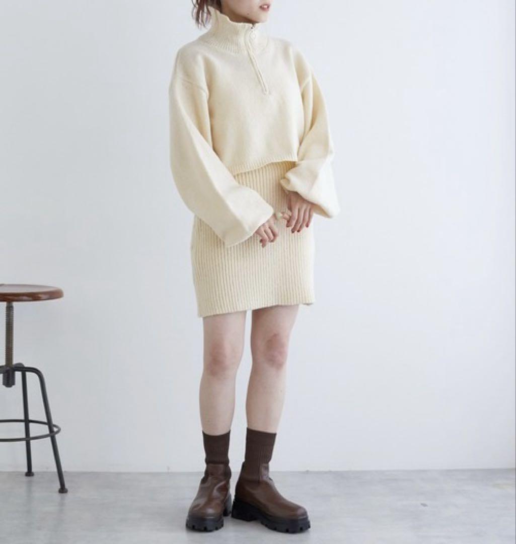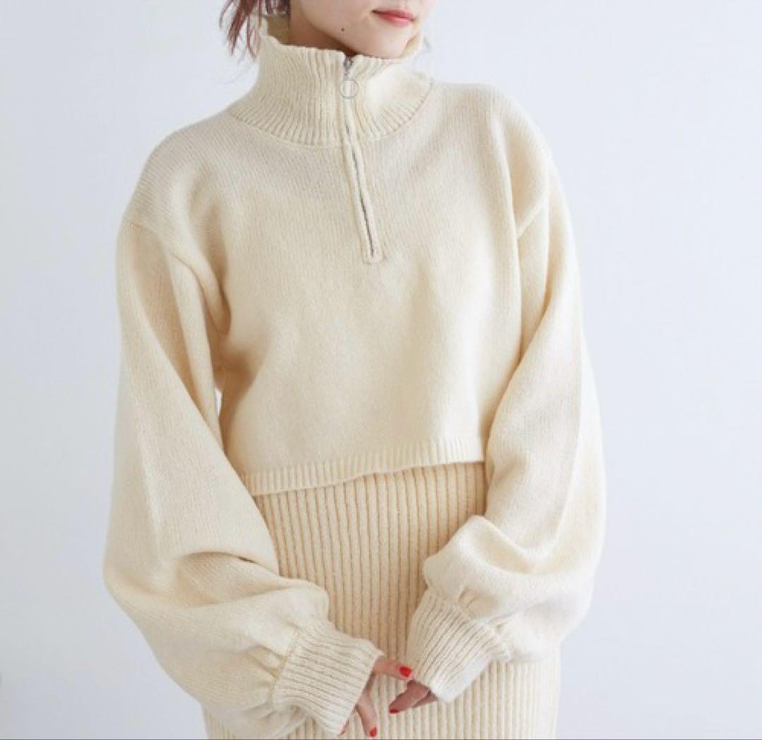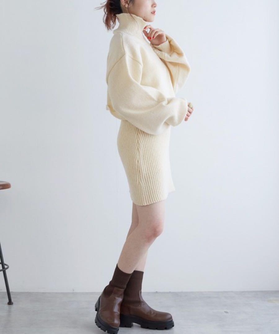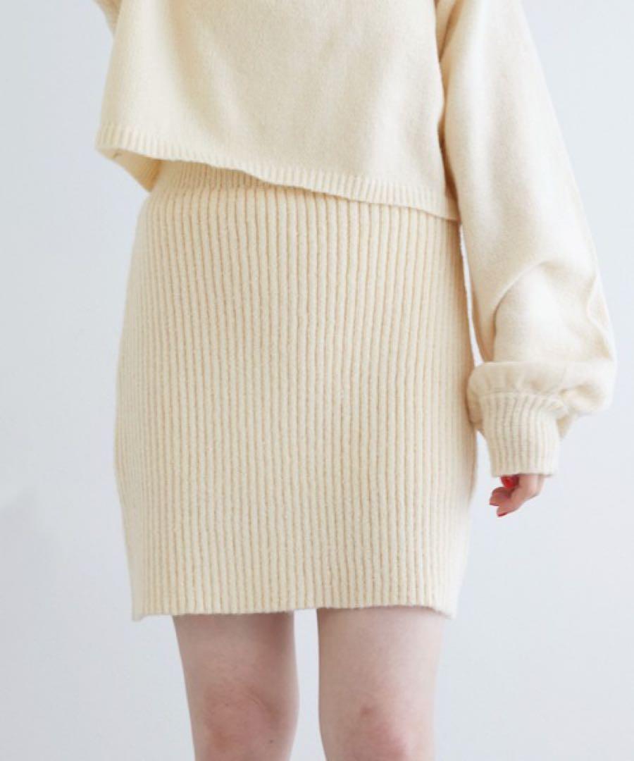 クリーム色のニットセットアップ、バルーンスリーブとリブ編みスカートが特徴。