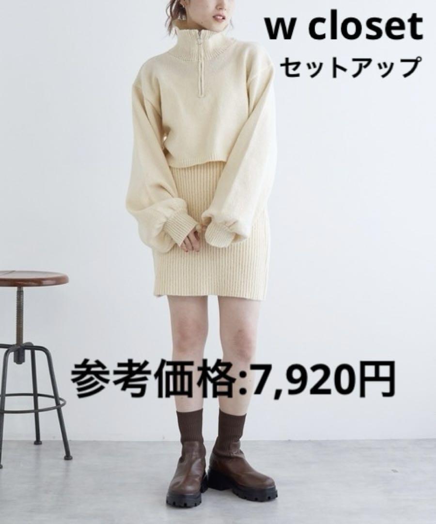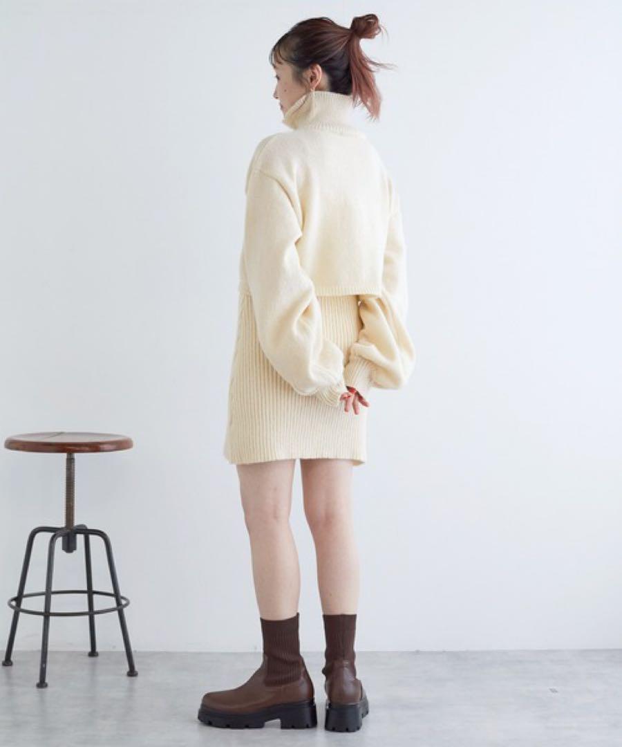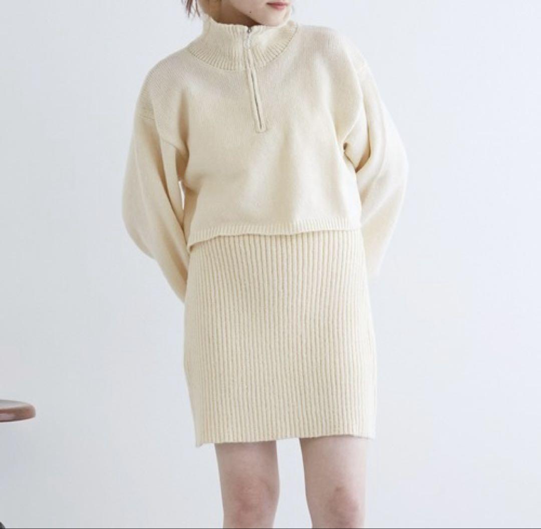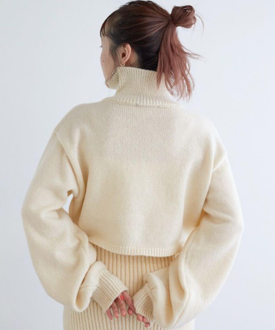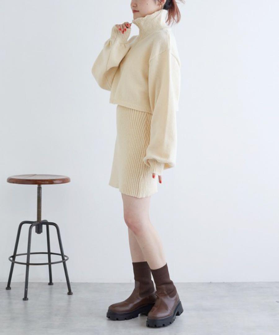 クリーム色のニットセットアップ、バルーンスリーブとリブ編みスカートが特徴。