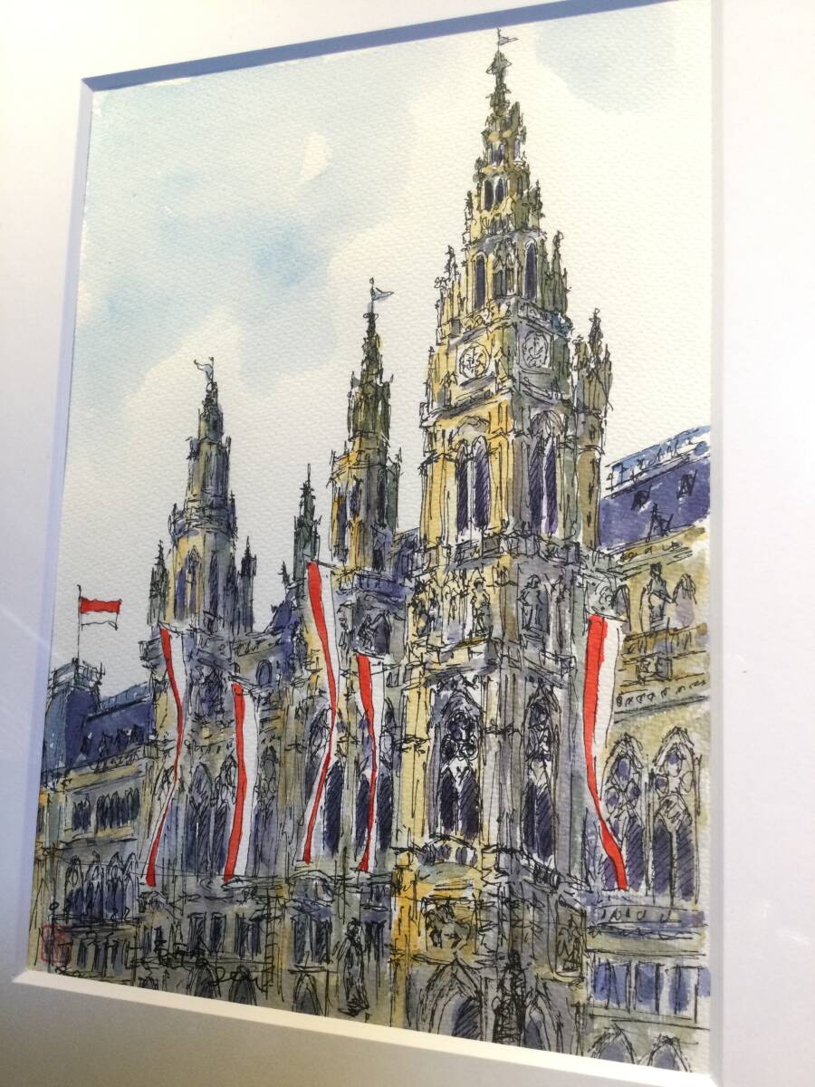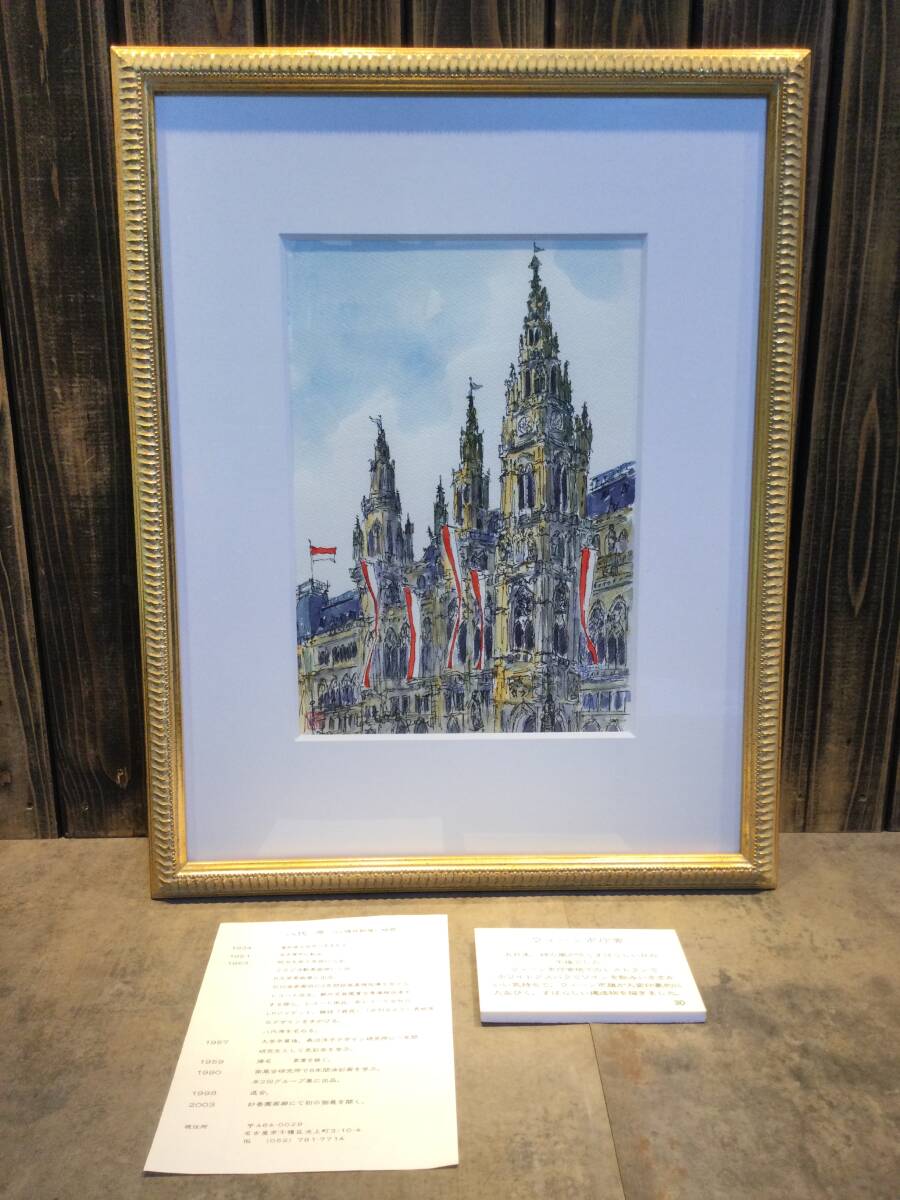 ・ 美品 真作 八代源 (磯貝幹雄) 「ウィーン市庁舎」 直筆サイン 額装 です。