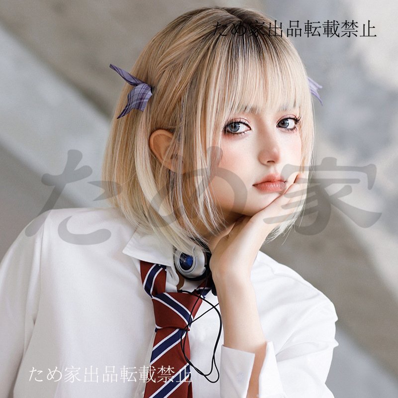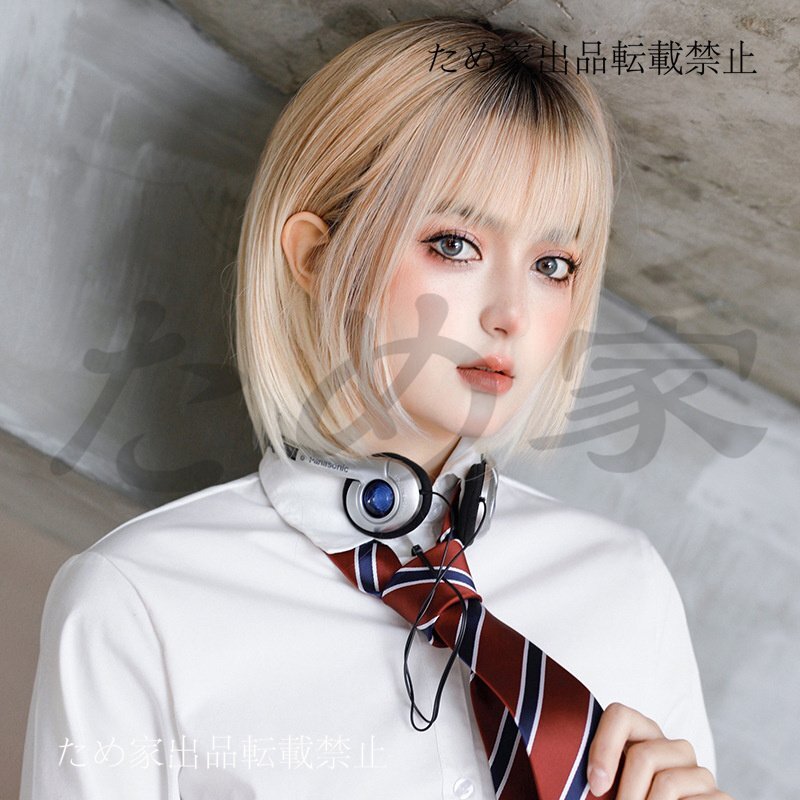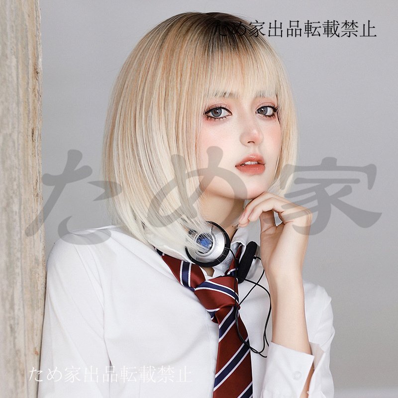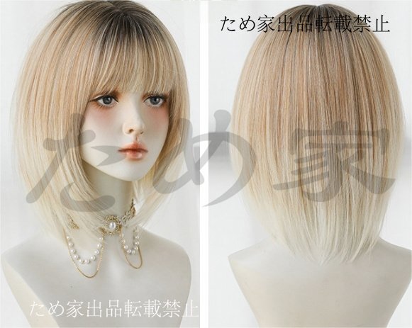 新品人毛 グラデーションカラー ショートストレート ぱっつん前髪 ホワイトティー系 つむじ部分手植え 自然に見えますフルウィッグ