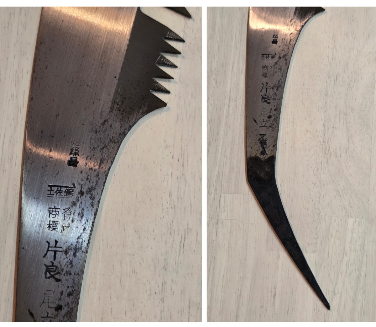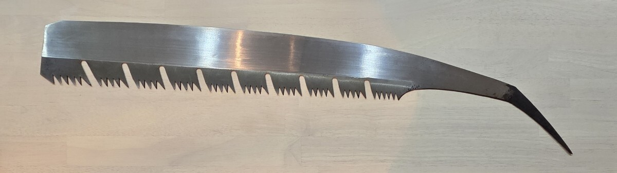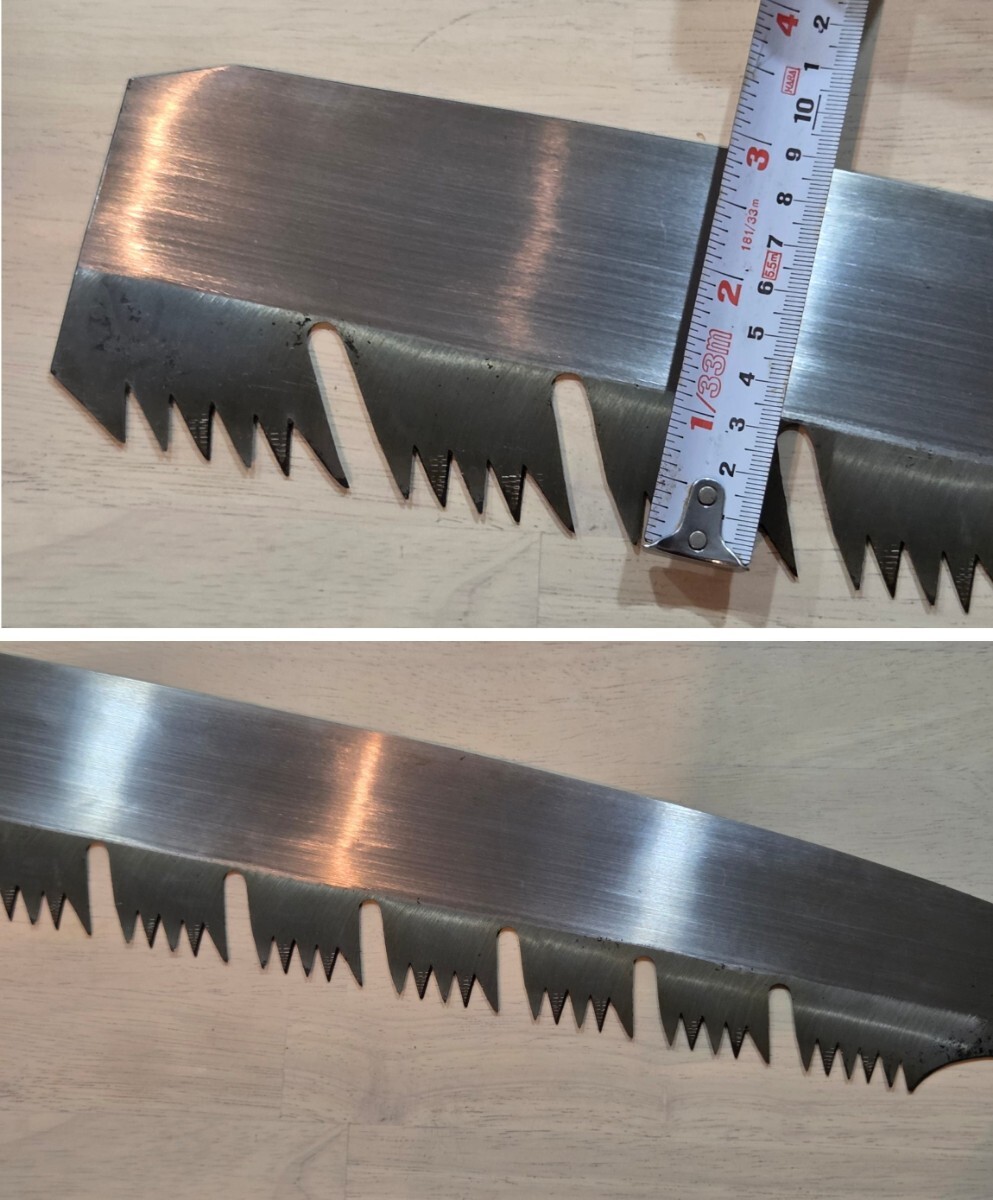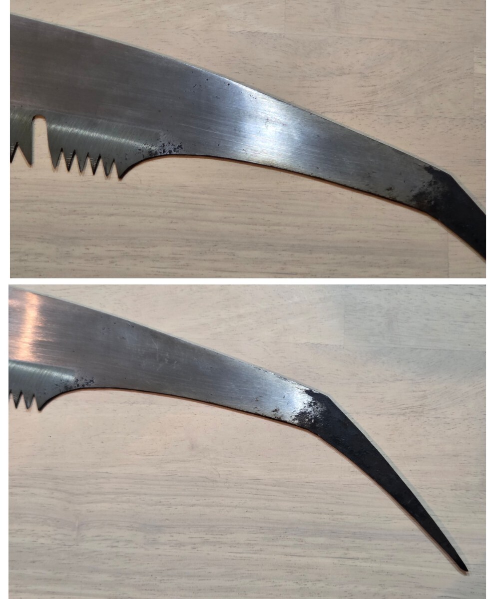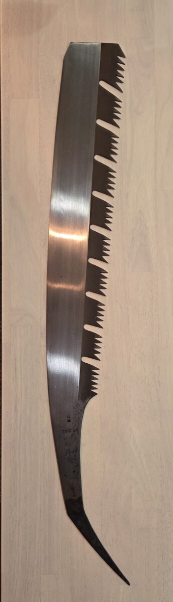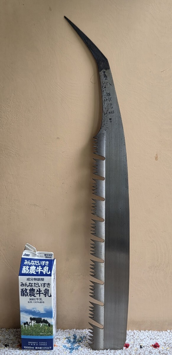 ご覧頂きまして有難うございます。 昭和初期、祖父の代より実家が全国各地に発送しておりました店内在庫品からの出品です。 本場・土佐の打刃物の歴史と伝統に培われた品質の高い高級打刃物でございます。 優秀な職人が高度な技法により丁寧に製造した既製品には出せない重厚さがあります。 保管期間が長い為、経年による擦れ、キズ、サビ等、ご理解頂けます方のご入札をお待ちしております。 ※店主が居りませんので、詳細は解りかねます。カタログと現在まで伝授された情報です。 画像をご覧になり、ご判断願います。 未使用・長期保管品 ★★一番下の歯が若干欠けているようです。(画像3をご参照ください) 同型・サイズで比較的状態の良いものを出品中ですので、 気になる方は、そちらでご検討くださいますよう、お願い致します。 ◆重量: 400g ◆長さ: 全長 73㎝ 刃中央部幅 9㎝ 刃長 49㎝ ※ 多少の誤差はご了承下さいませ。 ◆発送: ゆうパック60サイズの料金にてお届け致します。 | |||