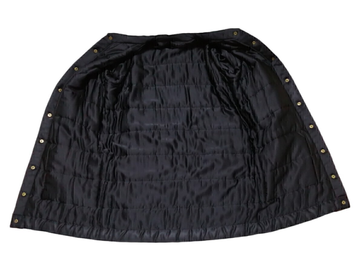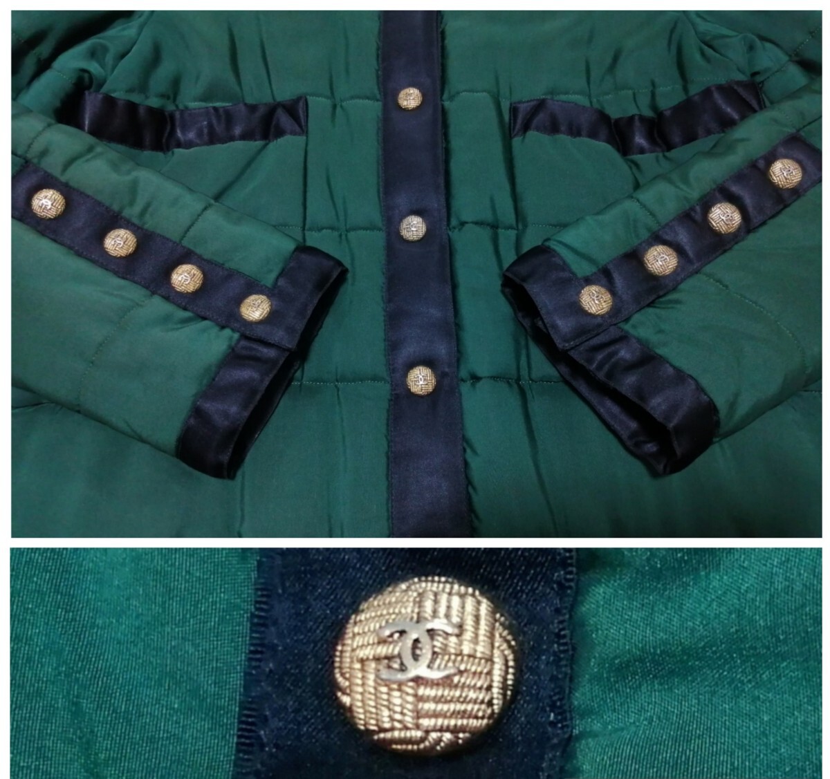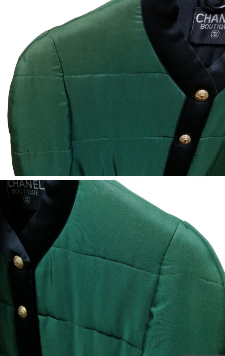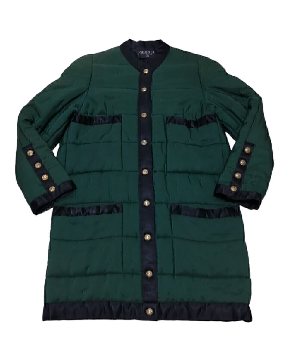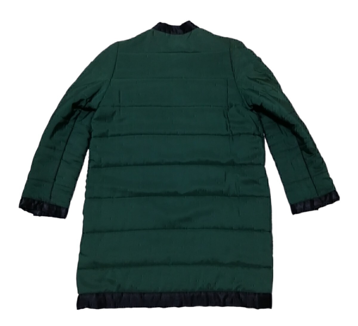 グリーンシルク生地の端にブラックシルクが縁取りされたエレガントな中綿入りのコートです。