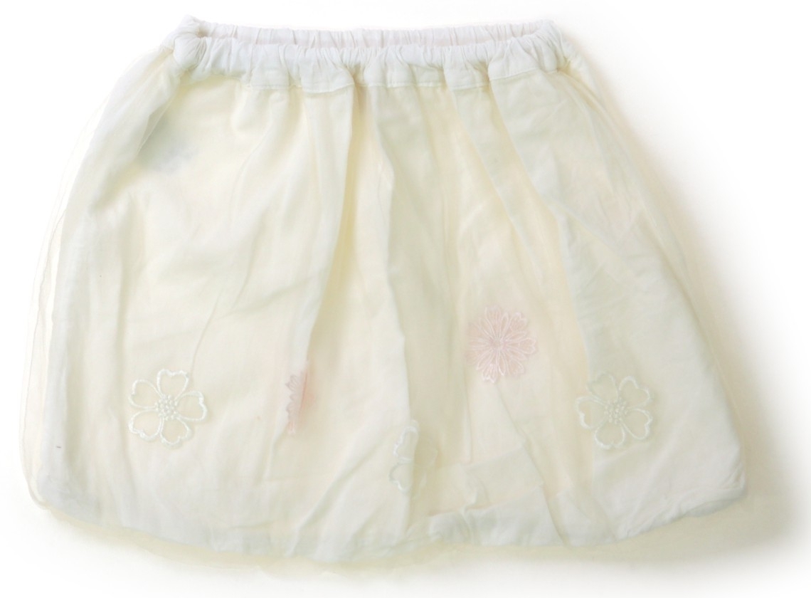 サイズ調整ゴムが付いています。チュール生地と、ストレッチのない綿の裏生地でバルーンのようなデザインになっています。後ろの裏地に小さい茶色い汚れあり。