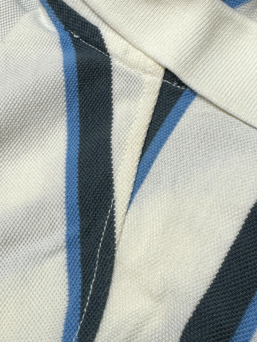ウォッシュ加工の施されましたホワイトの鹿の子ボディのボーダーポロシャツになります。