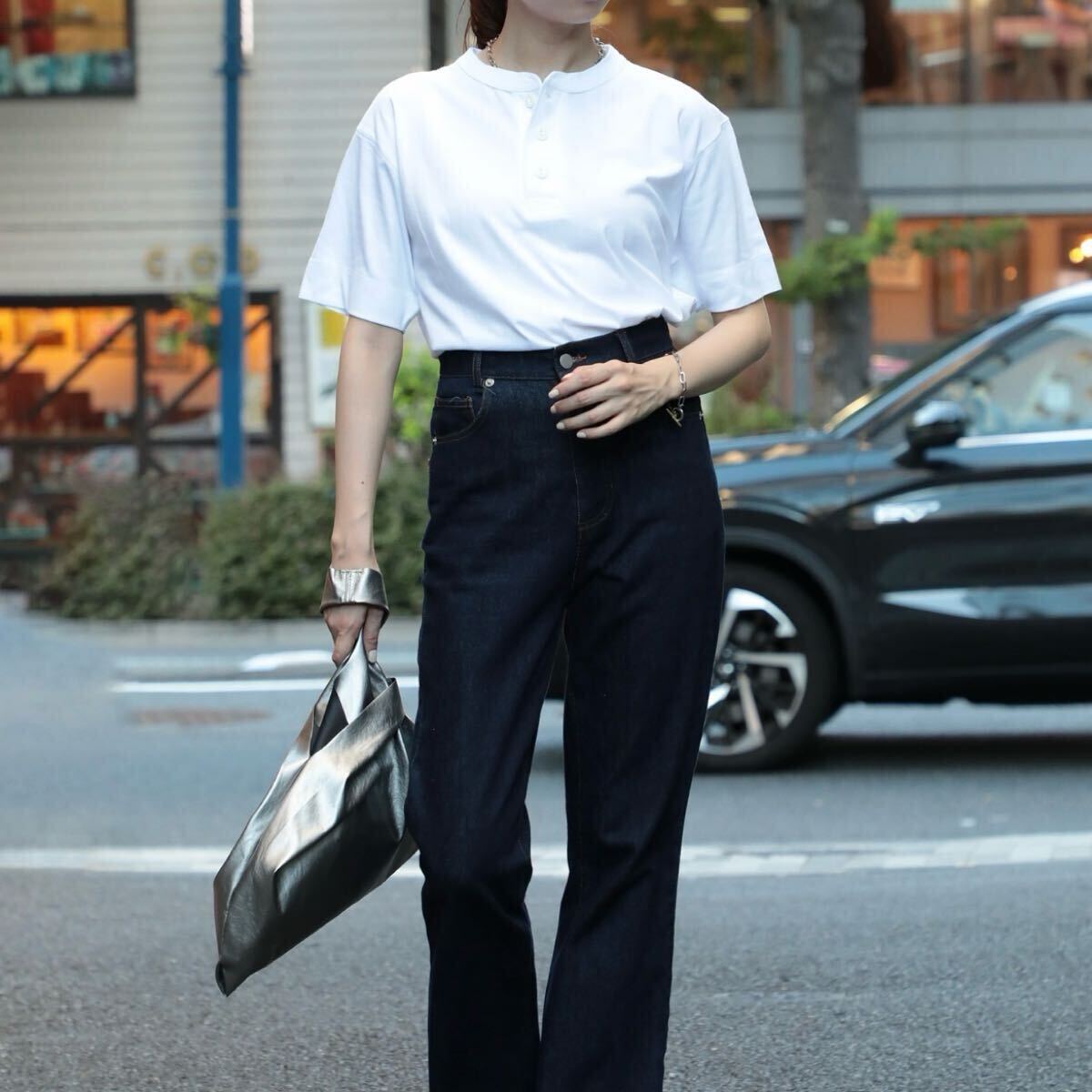 ヘンリーネックの襟元のちょっとした動きでスタイリングのアクセントに。