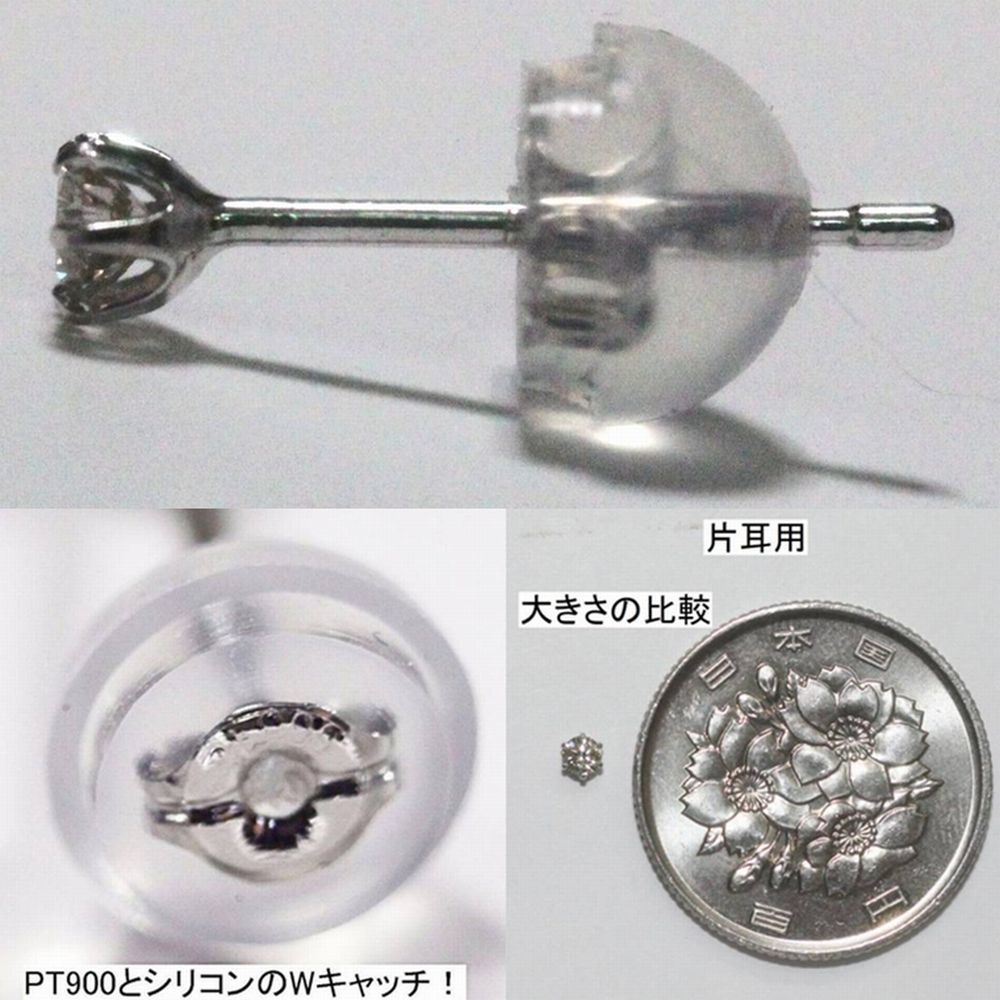 プラチナダイヤピアス、0.10ct(0.05ct&0.05ct)、キャッチはシリコンとプラチナ使用。大きさの比較で百円硬貨を参考にしてください。
