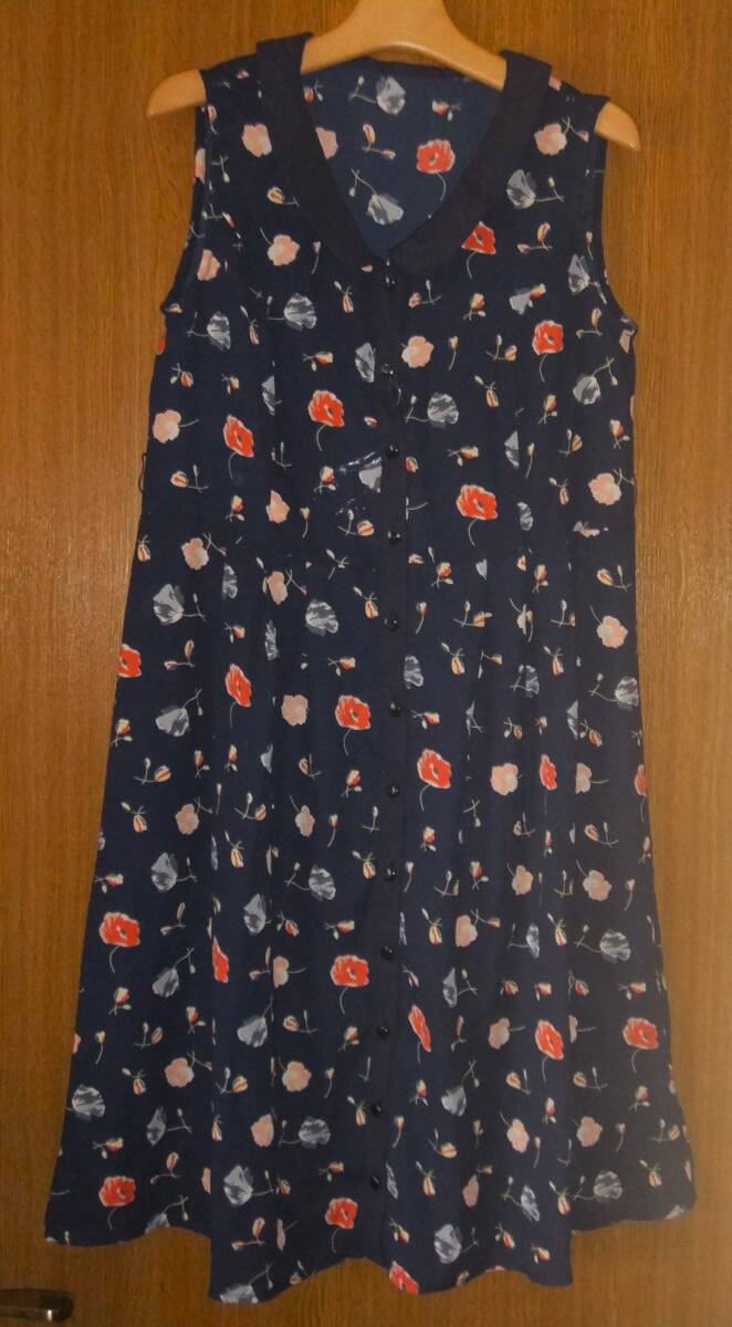 ネイビーです。プリントの花モチーフはレトロっぽい印象です。襟とボタンの部分のみ無地です。