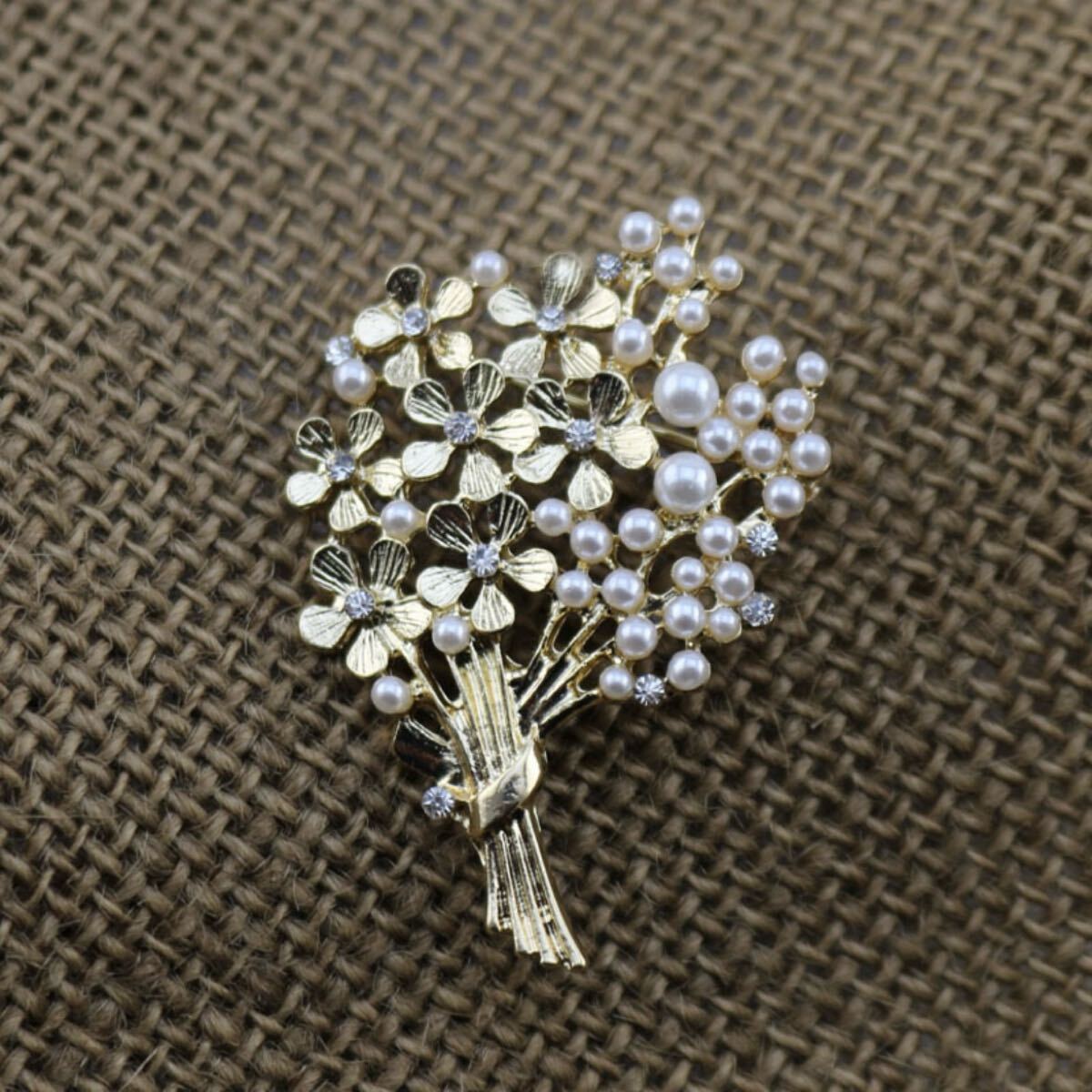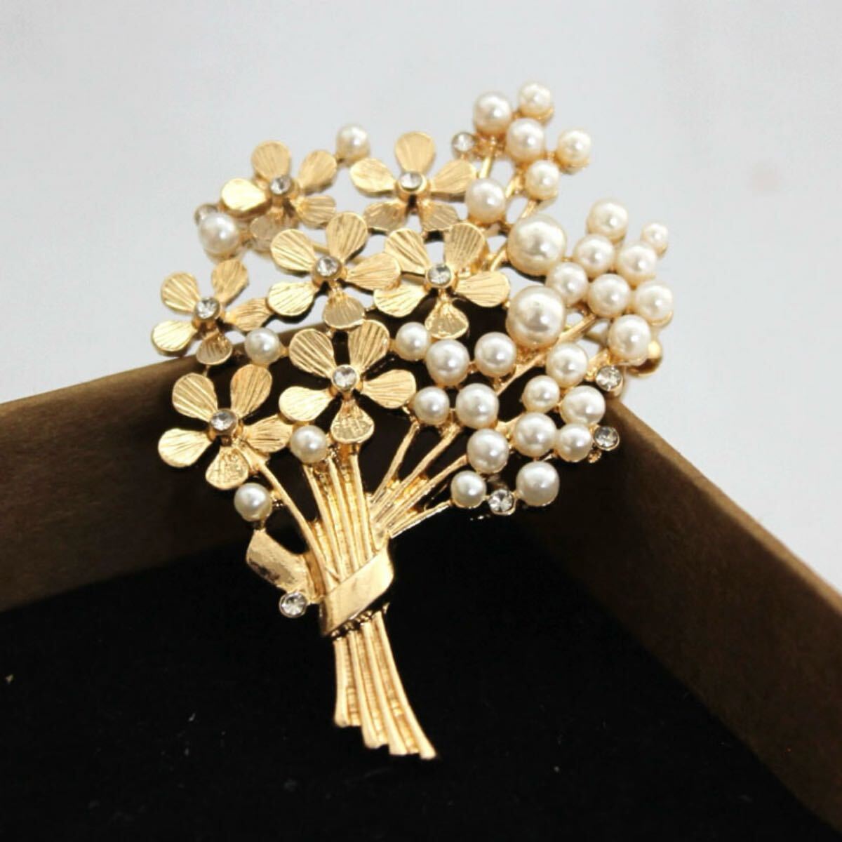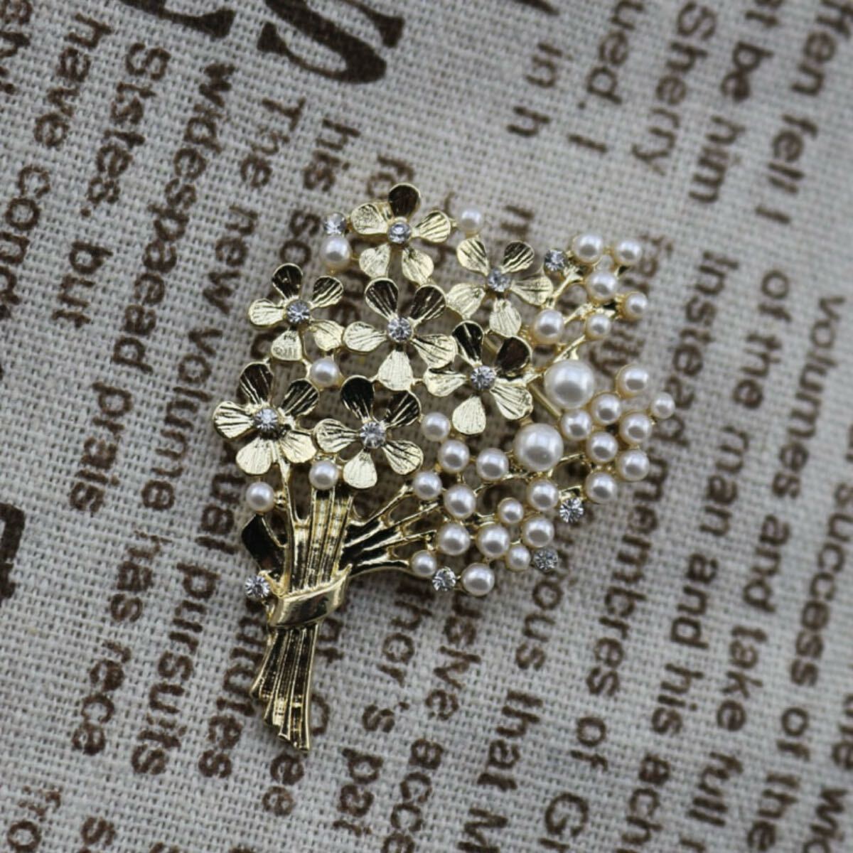 表面に溝加工を施したボタニカルフラワーと小粒パールを合わせたブーケブローチ。