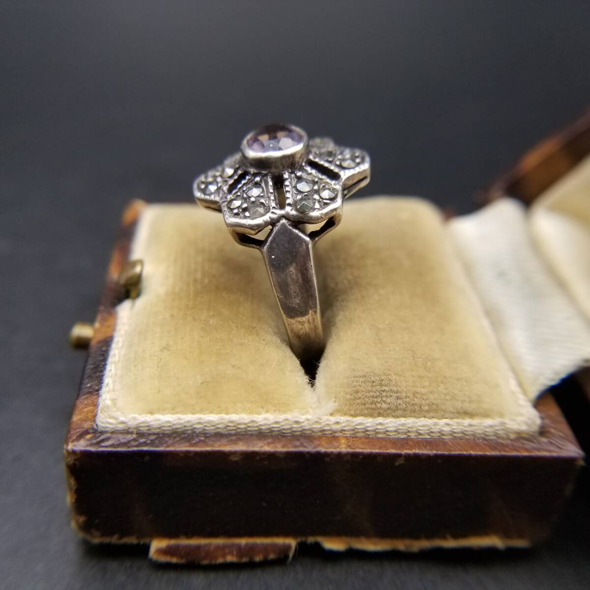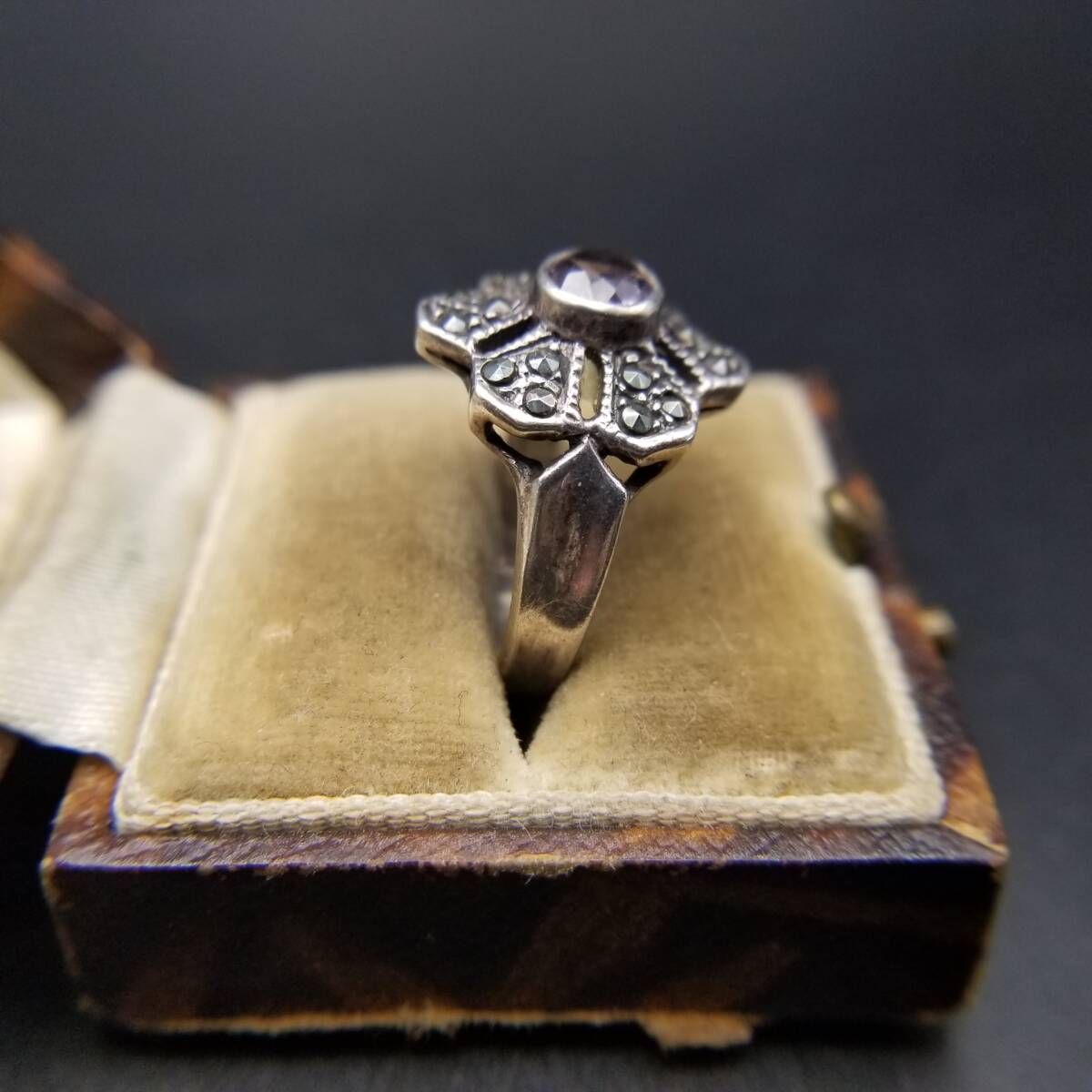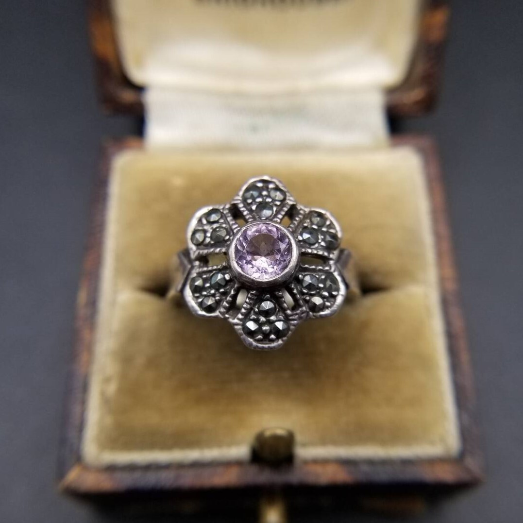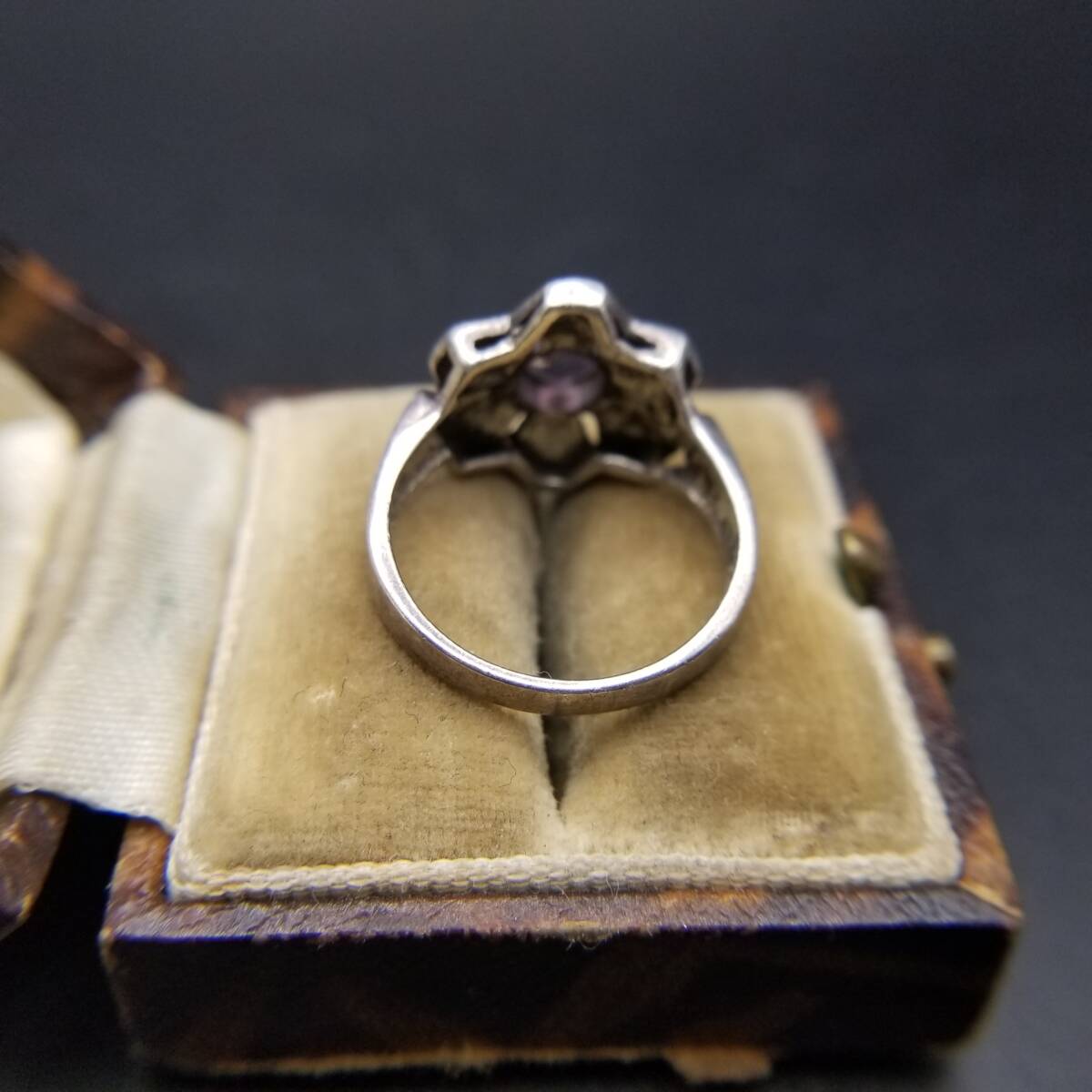 花型 アメジストガラス マーカサイト 925 シルバー ヴィンテージ フラワー リング 指輪 銀 レトロ キュート モチーフジュエリー Y23-H