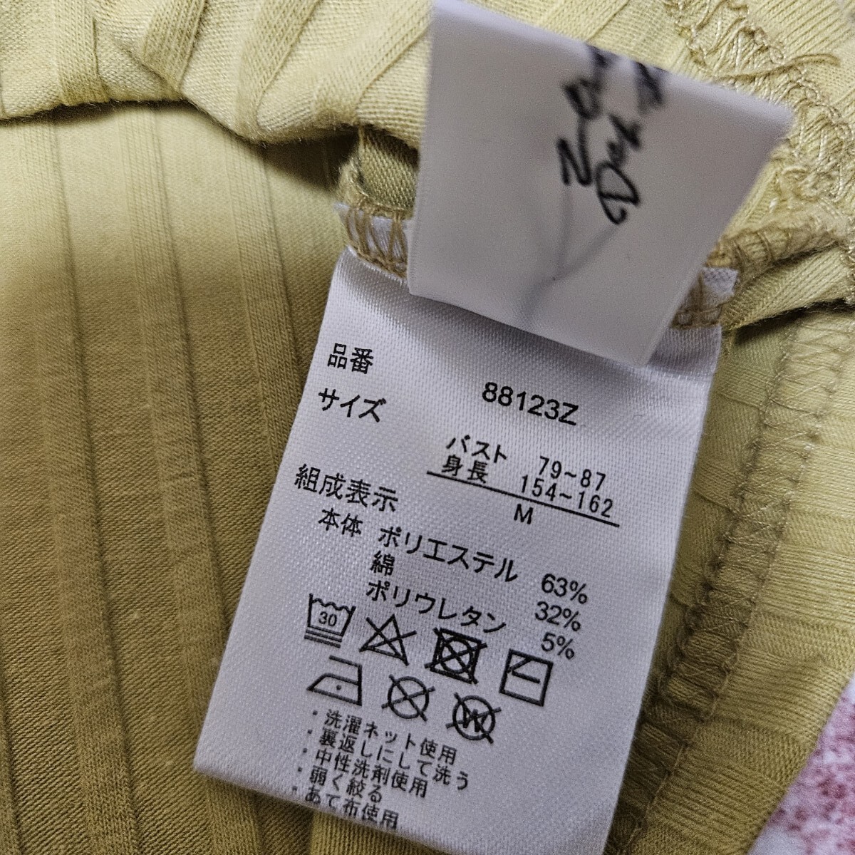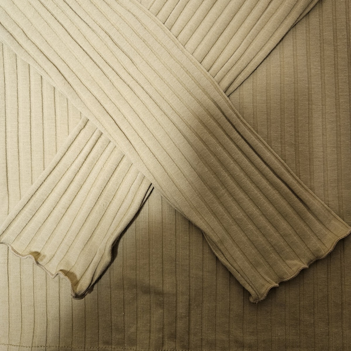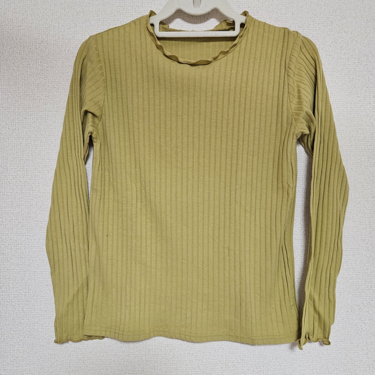 マスタード長袖Tシャツ、フリル付きネックラインが特徴。