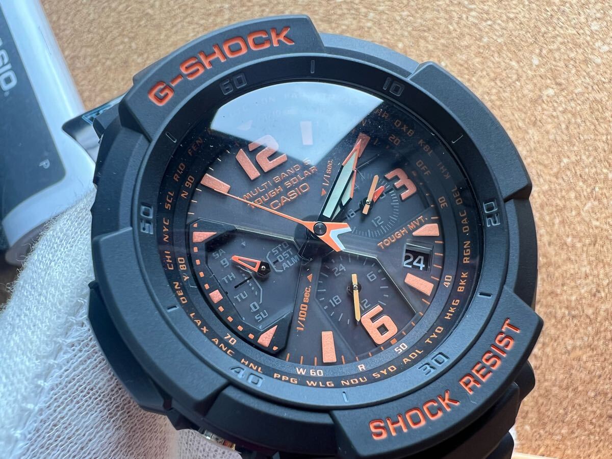 過酷な環境下で活動するパイロットのためのG-SHOCK「グラビティマスター」シリーズの電波ソーラーモデルです。