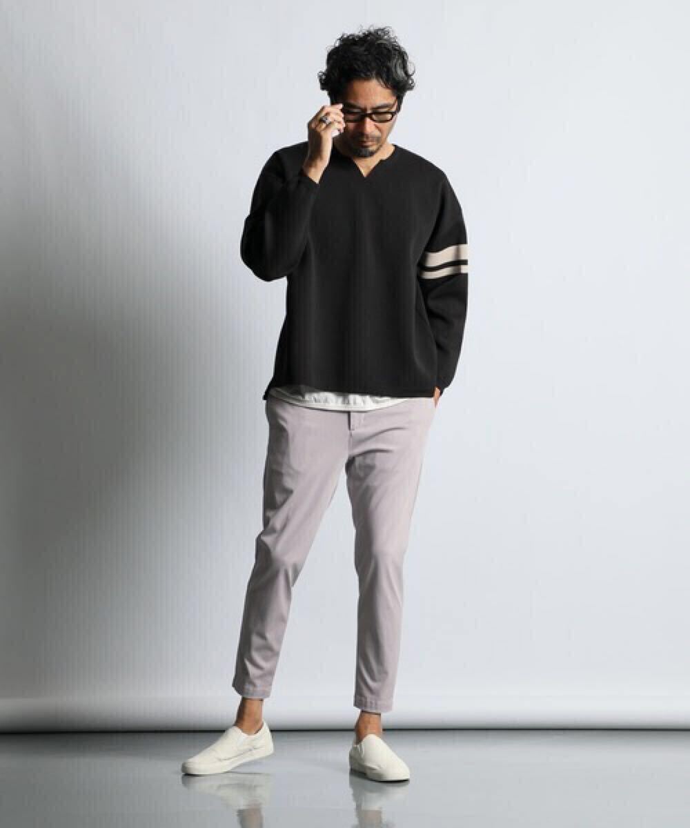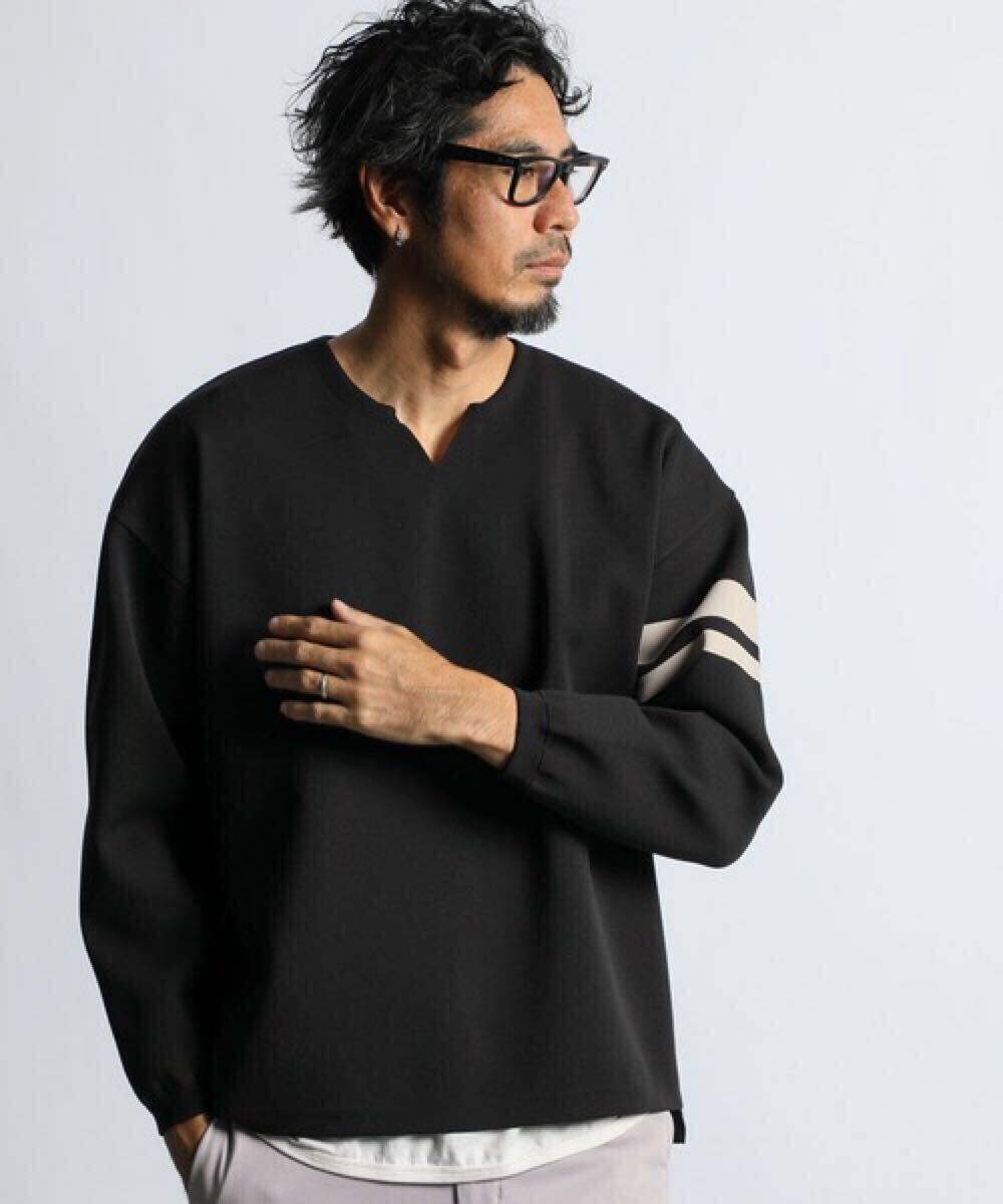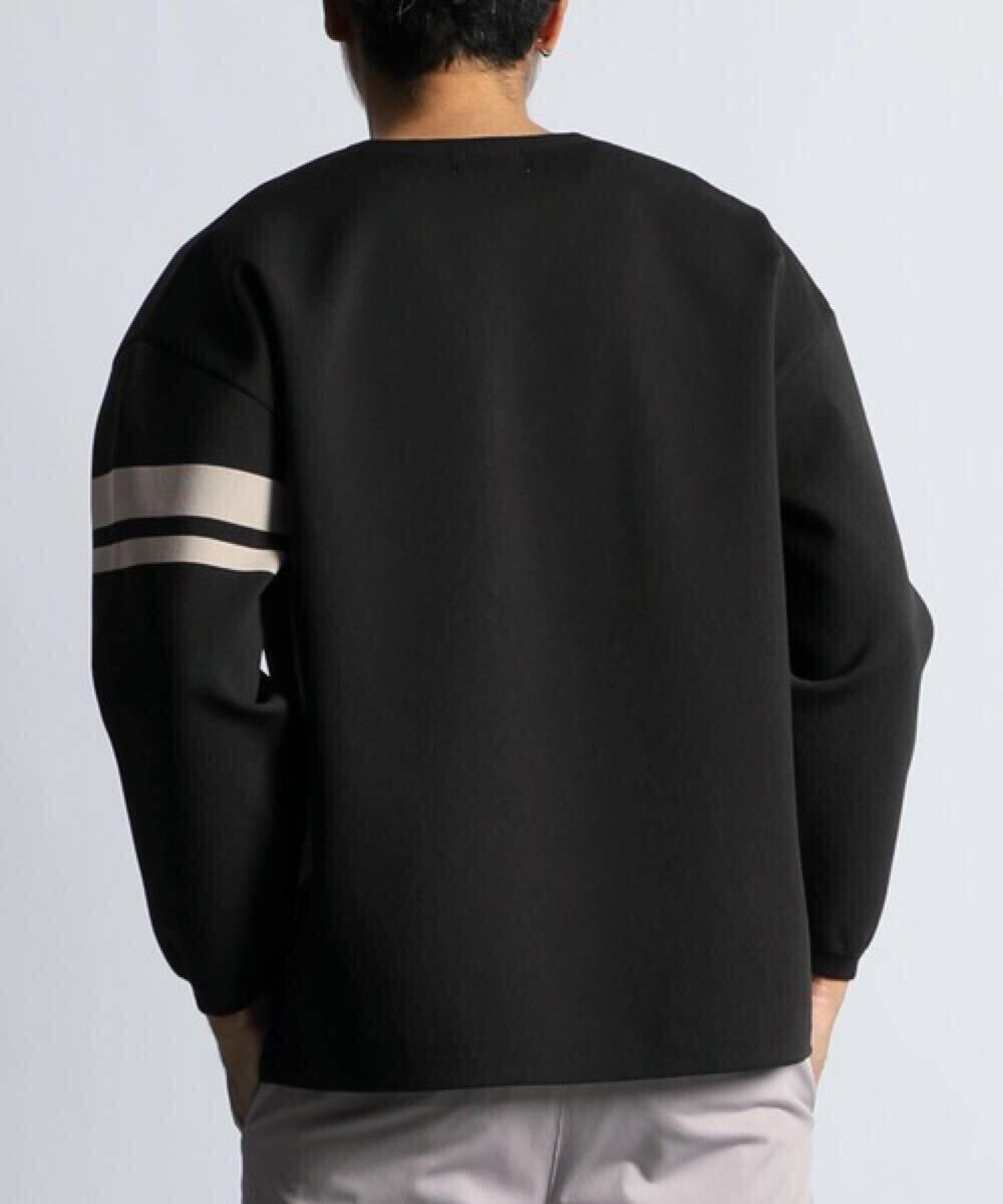 着用時に大きく肩が落ちて柔らかい印象となるゆったりシルエットが特徴のニット。首回りのキーネックデザインとリラックスしたシルエットなので、1枚でもサマになります。また、フットボールT-SHに見られるラインデザインを片袖に取り入れ、DUFFERらしいくカジュアルダウンさせています。ルーズフィット。