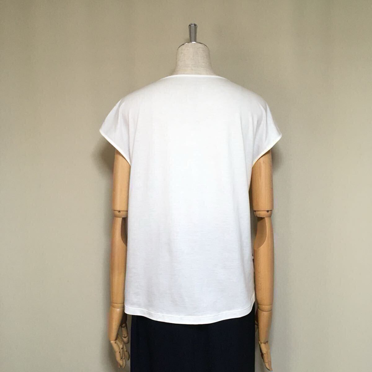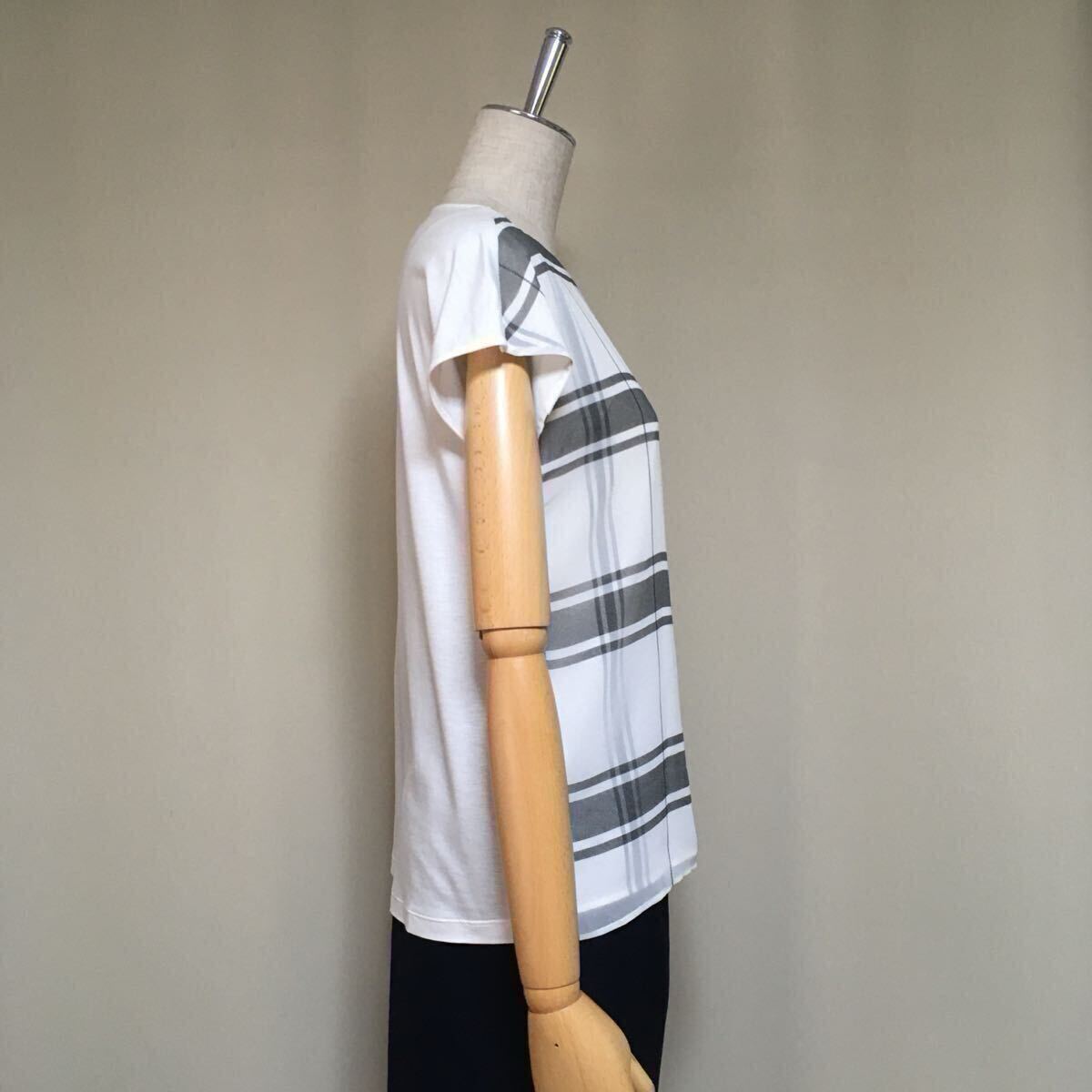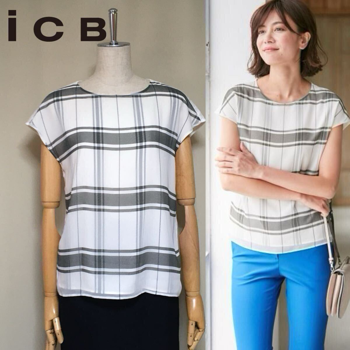 【美品】ICB アイシービー 定価1.5万 洗える チェックプリント カットソー ブラウス Sサイズ レディース ホワイト フレンチスリーブ