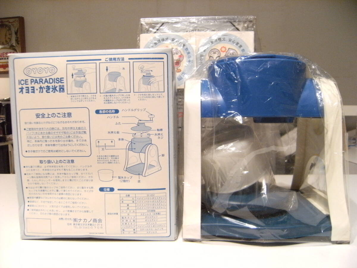新品・デッドストックですが、外装箱に少々汚れ・傷・シミ・ダメージ等あります。かき氷器に青色の色の違いがあります。ノークレーム、ノーリターンでお願いいたします。