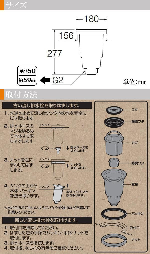 | 生ゴミも手を汚さずに処理できます。配管からのイヤな臭いを止めるトラップ構造です。 ※流し排水栓には種類があります。サイズ、形状(一槽シンク用、二槽シンク用、BL仕様流し台用)など、ご確認の上、お求めください。 |