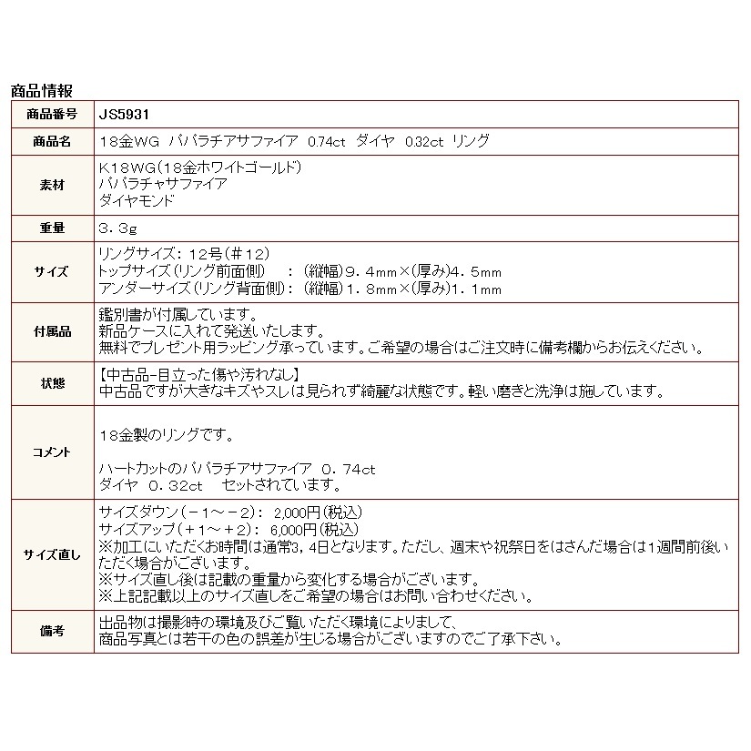 | 素材 | K18WG(18金ホワイトゴールド) パパラチャサファイア ダイヤモンド |