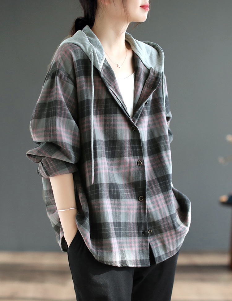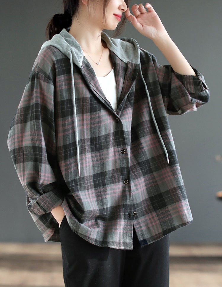 送料無料★送料無料★新品 ゆったり フード付き チェック 長袖トップス 薄手 アウター ナチュラル カジュアル レディース★グレー | ||||