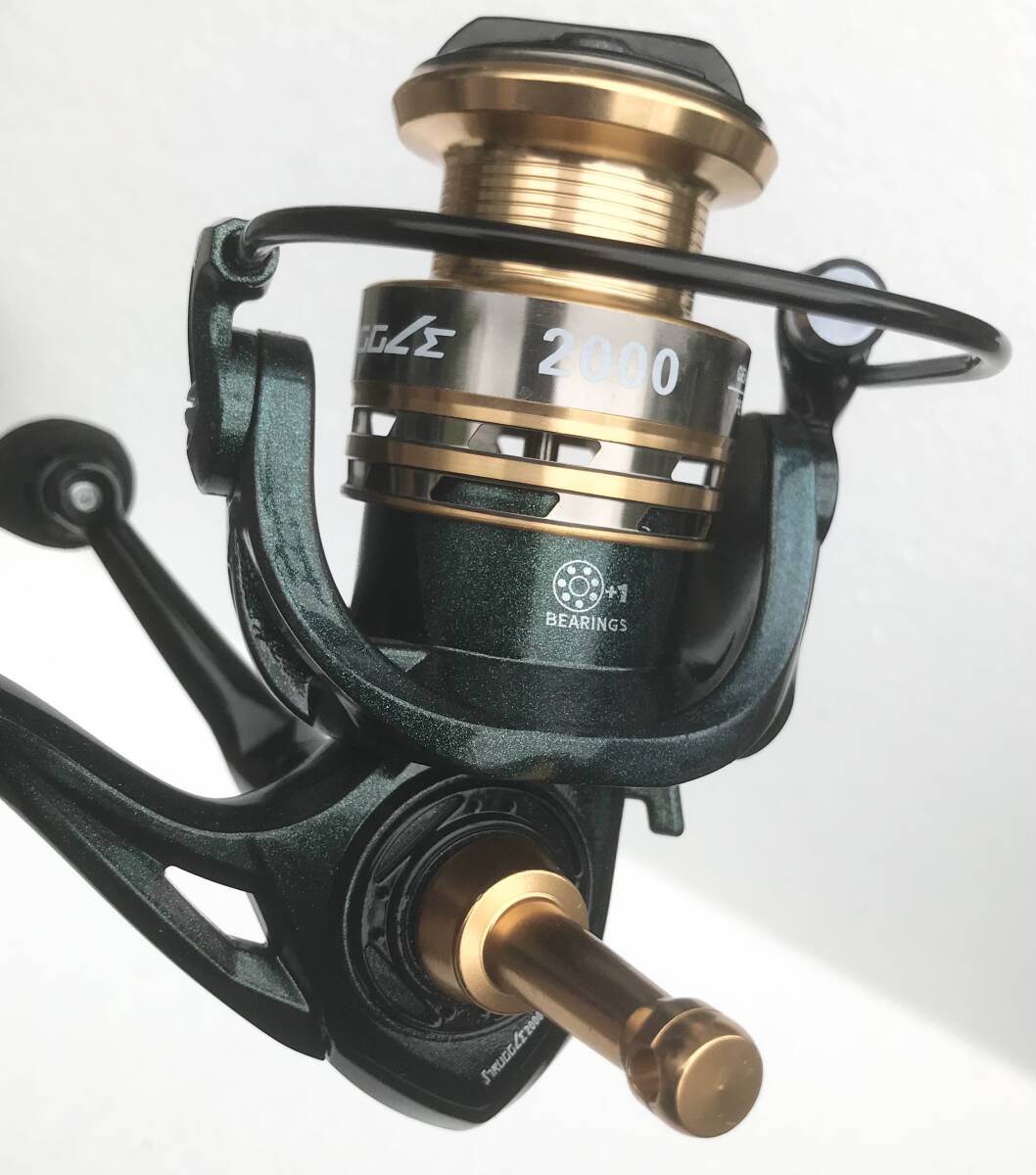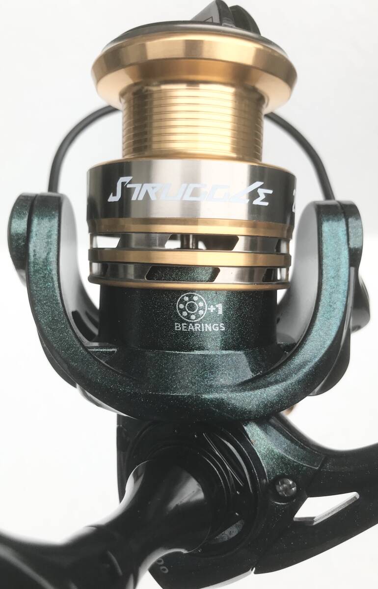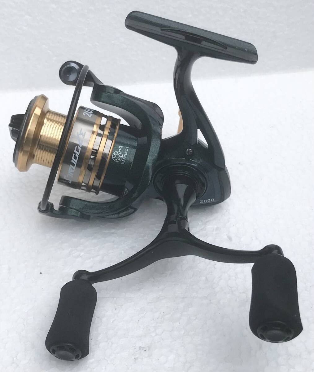 写真のSTRUGGLEスピニングリール2000ダークグリーンメタリックゴールド デュアルハンドル(新品未使用)を発送します(送料無料)。