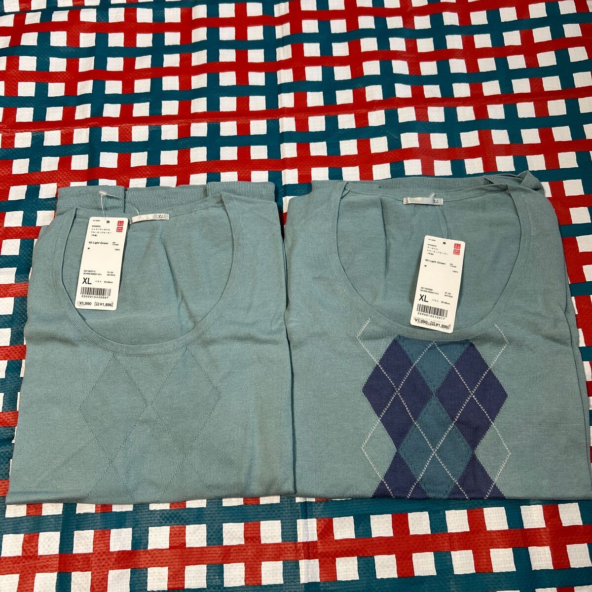 XL『ユニクロ』WOMEN シャドーアーガイルクルーネックセーター/アーガイルクルーネックセーター/50ライトグリーン 半袖 2枚セット