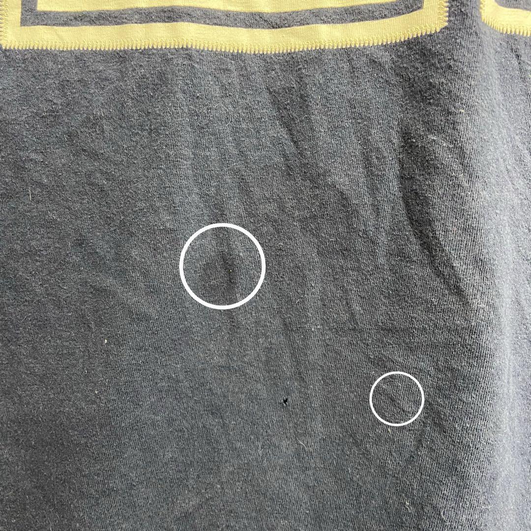 首元右、プリント「2」の中央部分、背面右下裾、右袖に黒い汚れがございます。ウエストの中央部分に小さな穴がございます。