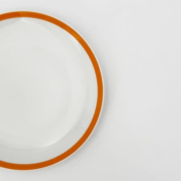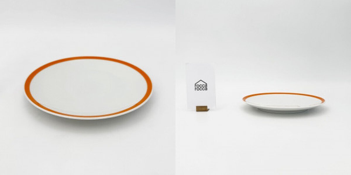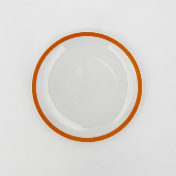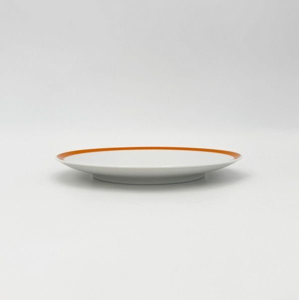 シンプルな白磁器にデザインされたオレンジのラインが目を引く、テーブルを華やかに彩ってくれる一品です。