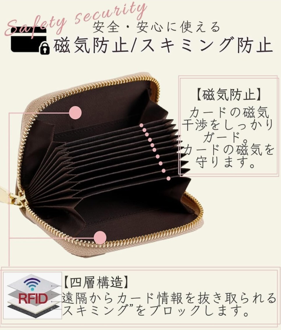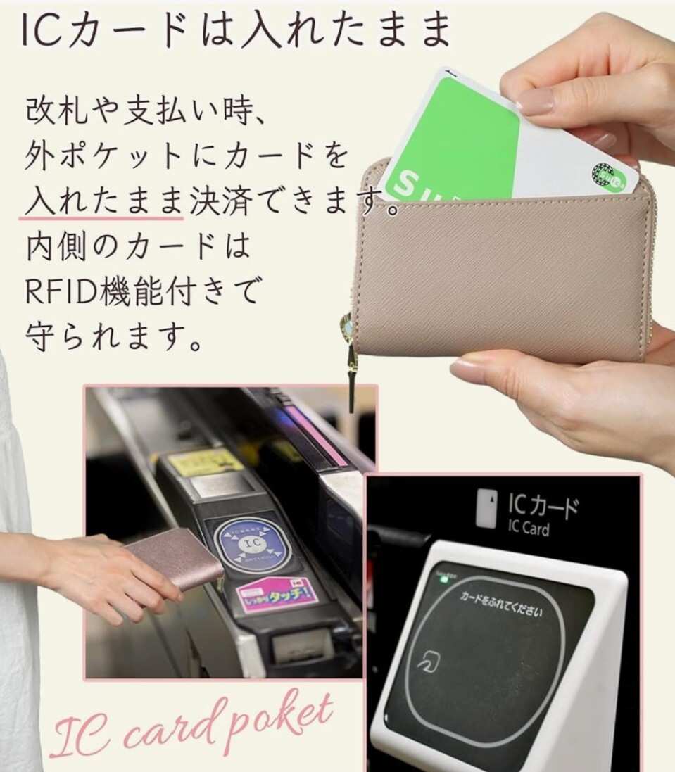 【ICポケット/スキミング防止】中のカードはRFID機能が付帯しており、外からスキミングをすることができない設計。年々増えているスキミング被害から大事なカードを守ります。外ポケットはポケットにICカードを入れたまま改札を通ったり決済したりできる、日常に便利なポケットです。