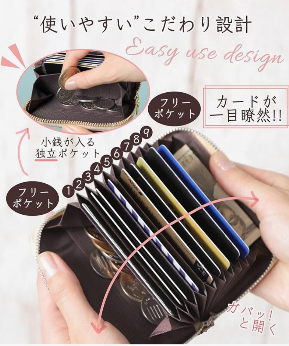 【“使いやすい”を追求】取り出したいカードが一目で見つかるじゃばらカード入れは、本人はカードの出し入れがしやすく、周りからは財布の中身が見えづらくなるように開く角度にこだわり設計しました。「ファスナーを開けるだけ」のワンアクションで支払いがスムーズにできる優秀設計です。