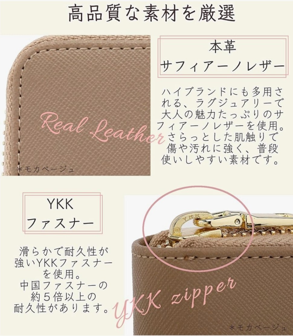 【高品質本革&滑らかYKKファスナー】ハイブランドでも使われる本革“サフィアーノレザー”を使用しています。さらっとした肌触りでラグジュアリーな艶がありますが、傷や汚れに強く普段使いしやすい素材です。YKKゴールドファスナーは従来のファスナーの5倍以上の耐久性があり、スムーズで、毎日安心してお使いいただけます。