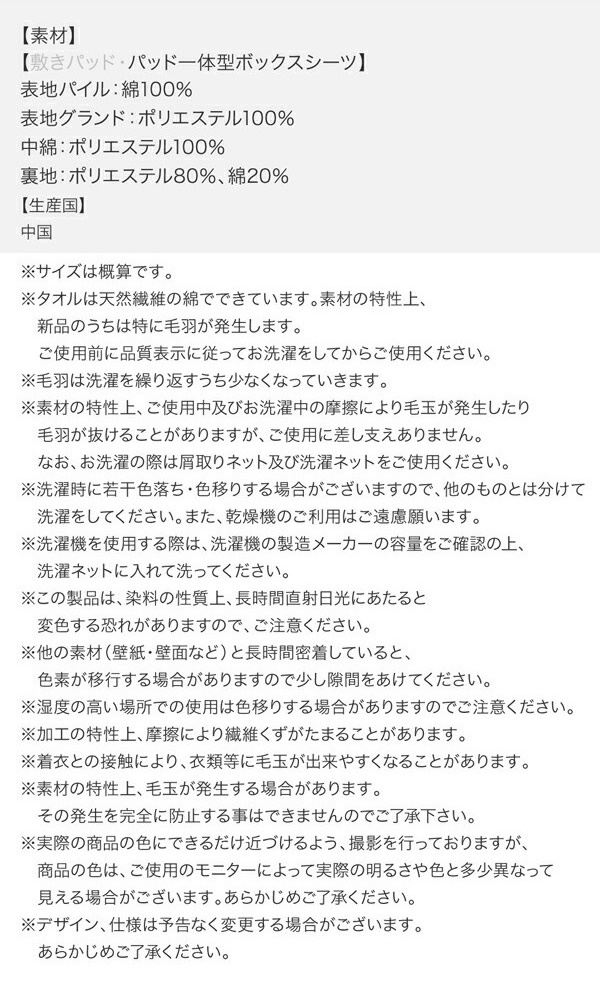 ![]() ショート丈専用 ザブザブ洗えて気持ちいい コットンタオル パッド一体型ボックスシーツ 2枚 セミシングル ショート丈 さくら ![]() ◇◆支払詳細◆◇ ※代引き・同梱不可 ◇◆発送詳細◆◇ 納 期:メーカー倉庫直送(入金確認後4営業日内発送) ※商品は玄関渡しになります。 ※北海道・沖縄県へは送料がかかります。ただし、離島は配送不可です。予めご了承ください。 ※離島について:本州・本島などと橋でつながっている場合にも該当致します。 その他一部地域についてお届けができかねる場合があります。 ![]() ■土日祝はお休みさせていただきます。 ■初期不良の場合はお届け後1週間以内に限り返品交換対応可能です。 ■到着後、破損不良等の有無をお確かめ下さい。 ■配送時の梱包のまま交換お願いします。 ■梱包材が無い場合でのお引取りはできませんのでご注意下さい。 ■お客様都合によるイメージ違い、サイズ間違い等の事由では、交換・返品・キャンセル等お受けできません。 ![]() ■在庫状況は日々変動しており、お支払いのタイミングによってはメーカー在庫が欠品となる場合がございます。 ■生産状況や同時注文等により、欠品となる場合もございます。 ■在庫切れの場合はキャンセルとしてお受けいたします。 ■最新の在庫状況のご確認は、質問欄よりお問い合せくださいませ。 ◇◆コメント◆◇ |