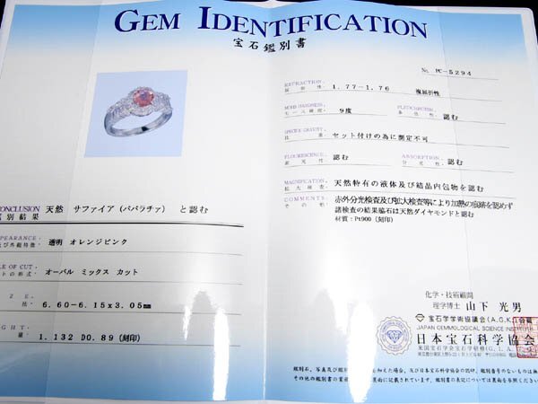 ◆安心の品質!!!【日本宝石科学協会】発行 宝石鑑別書&非加熱分析報告書付き!!! 豪華絢爛!!! 極上非加熱パパラチャサファイア 大粒1.132ctと、極上ダイヤモンド 総計0.89ctを贅沢に宝飾した、超高級リングをご紹介いたします!!! その美しい色から「蓮の花」を意味した名前をもつ、産出量が極めて少ない希少宝石 パパラチャサファイア!!! こちらはその中でも更に希少な天然非加熱の極上パパラチャサファイアで、1.132ctと大粒サイズ!!! 市場に出回るコランダムの90%以上が加熱処理を施されたお石の為、大粒サイズの非加熱パパラチャサファイアでこのお色・この輝きは、希少価値・資産価値共に高い逸品でございます!!! 極上非加熱パパラチャサファイアの、天然無処理のオレンジピンクの極上カラーの美しい輝きを、大粒サイズの存在感と共にお楽しみくださいませ!!! 周囲には、1石1石が眩い煌めきを放つ極上ダイヤモンドを、総計0.89ct贅沢に宝飾!!! 極上ダイヤの輝きが、大粒の極上非加熱パパラチャサファイアを一際華やかに輝かせます!!! エレガントに仕上げられたリングデザインには、高級素材Pt900を使用!!! プラチナの質感が、高級感を高めています!!! こちら格安での出品となっておりますので、この機会是非お見逃しなく!!! ◆こちらの商品はお客様の希望がある場合のみ、評価をつけております。 評価希望のお客様は、オーダーフォームの要望欄にてお知らせくださいませ。 |