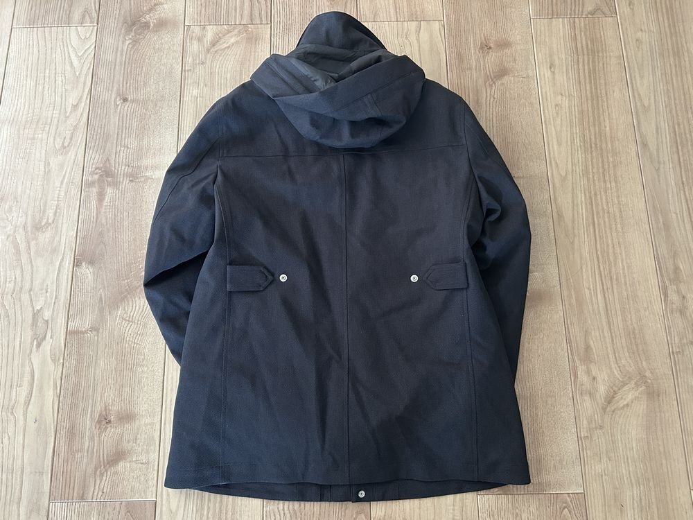 ベーシックなボックスシルエット、ライナーとフードが取り外し可能な3WAYコートです。フードを外すとスタンドカラーのコートになります。スーツやジャケットの上からも着られる丈バランス設定にしています。