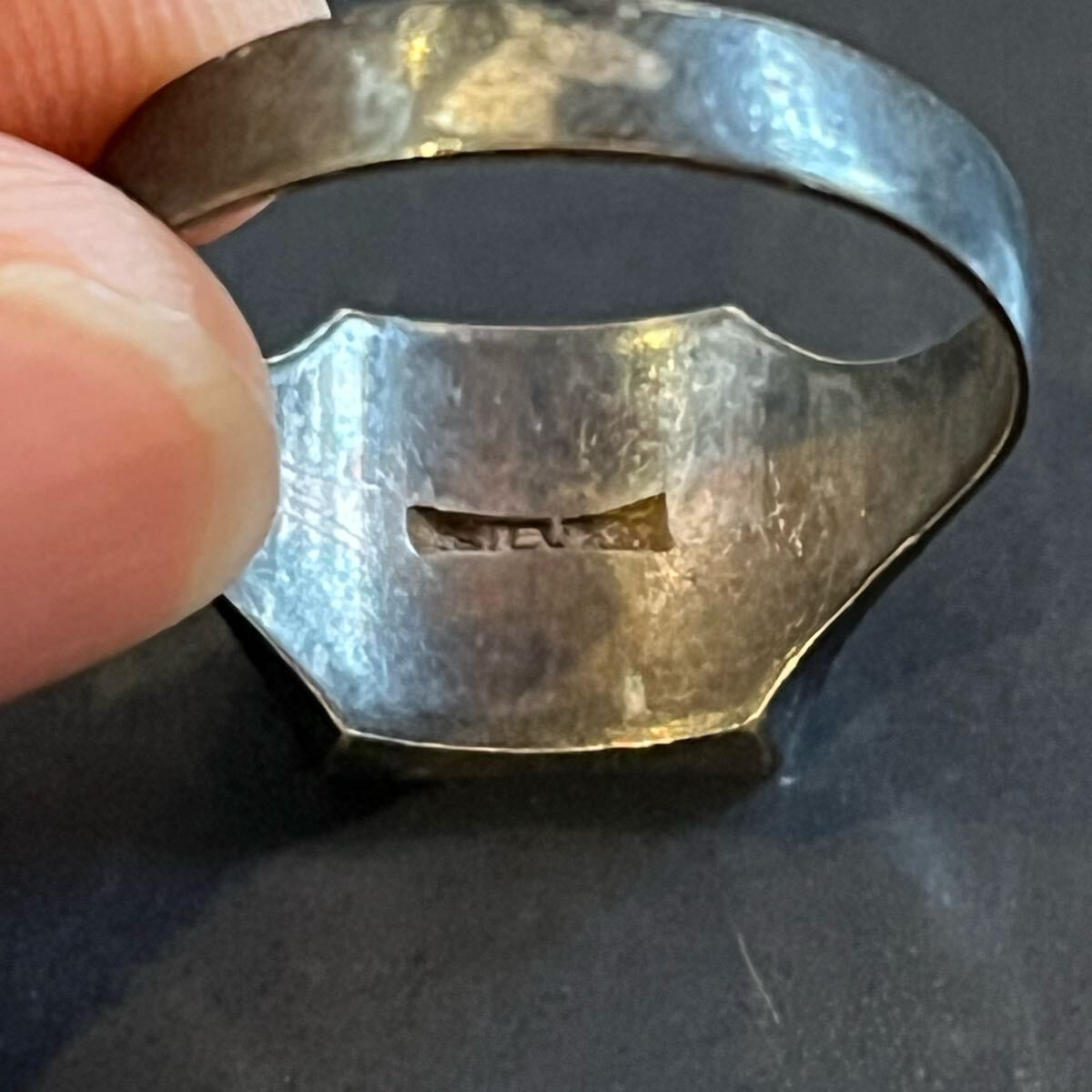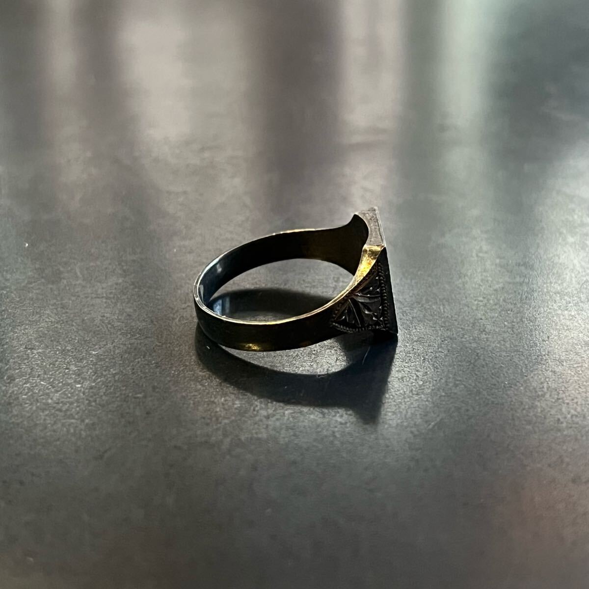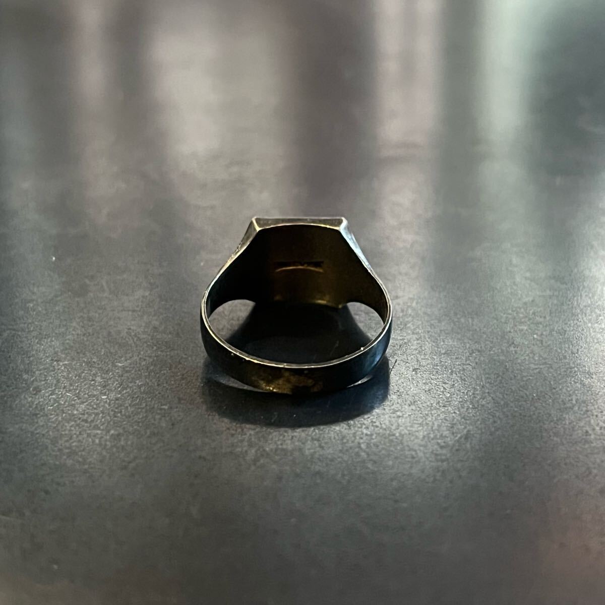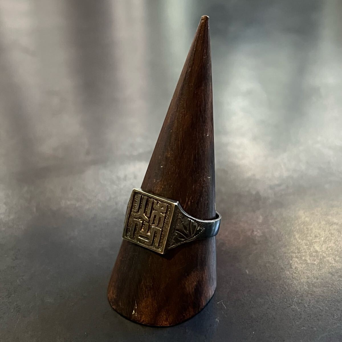 重厚感のある、オールドの印台リングです。正面には四角いプレートに力強い漢字の刻印が施されており、和の雰囲気と存在感を兼ね備えたアイテムとなっております。ユニセックスでお使いいただけるデザインですので、ファッションのアクセントとしておすすめの逸品です。