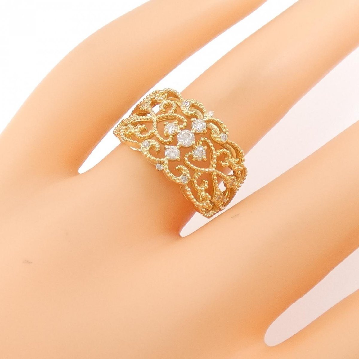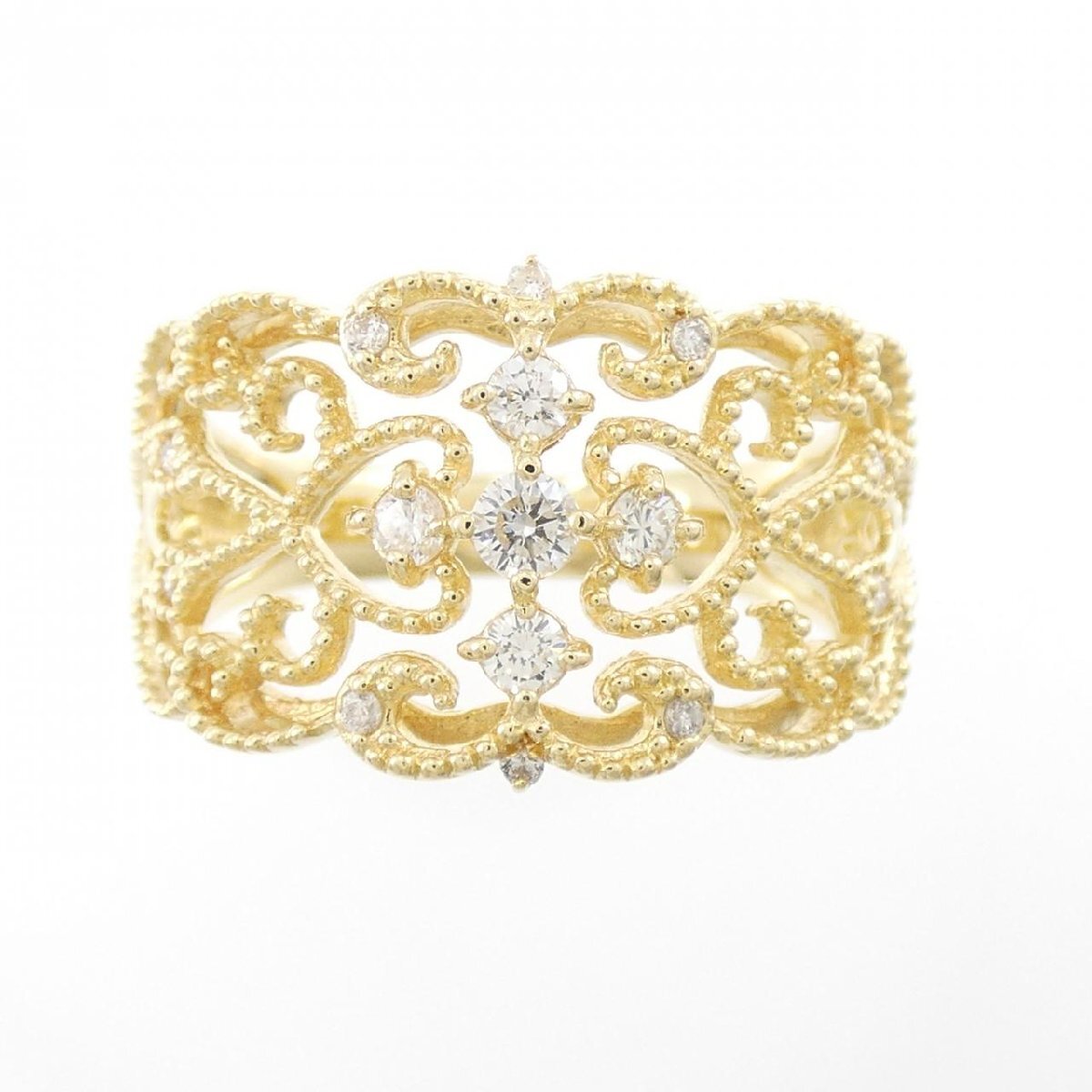 繊細なデザインがオシャレなリング。照りの良いダイヤモンドがあしらわれています。