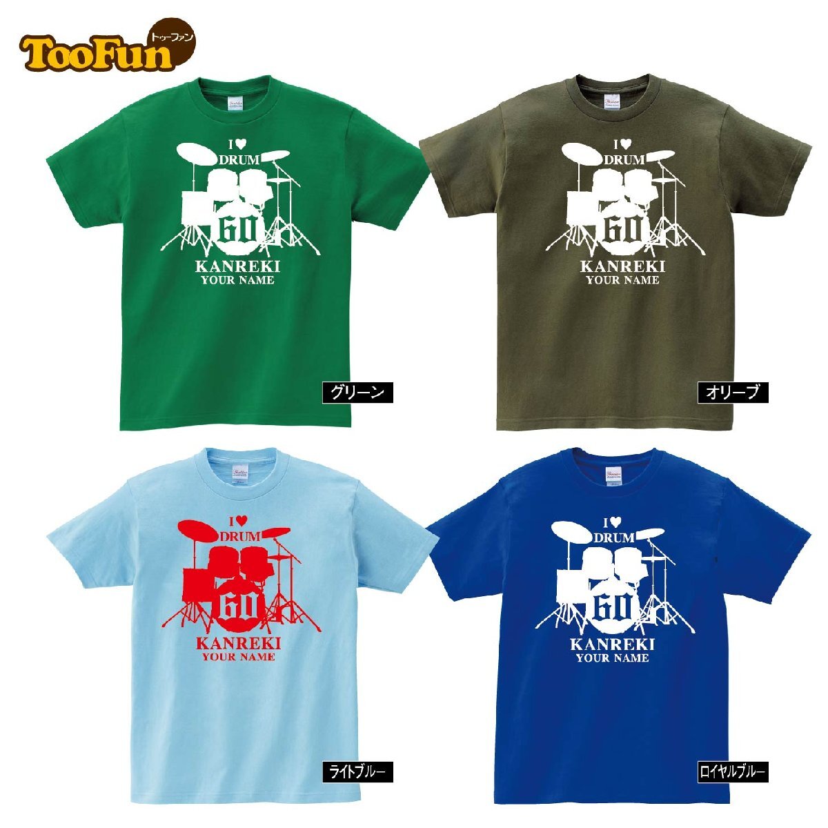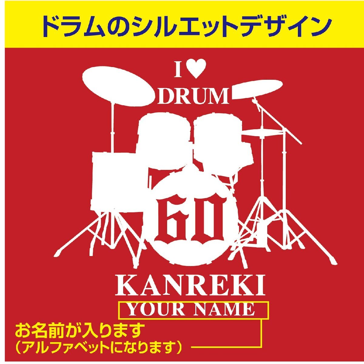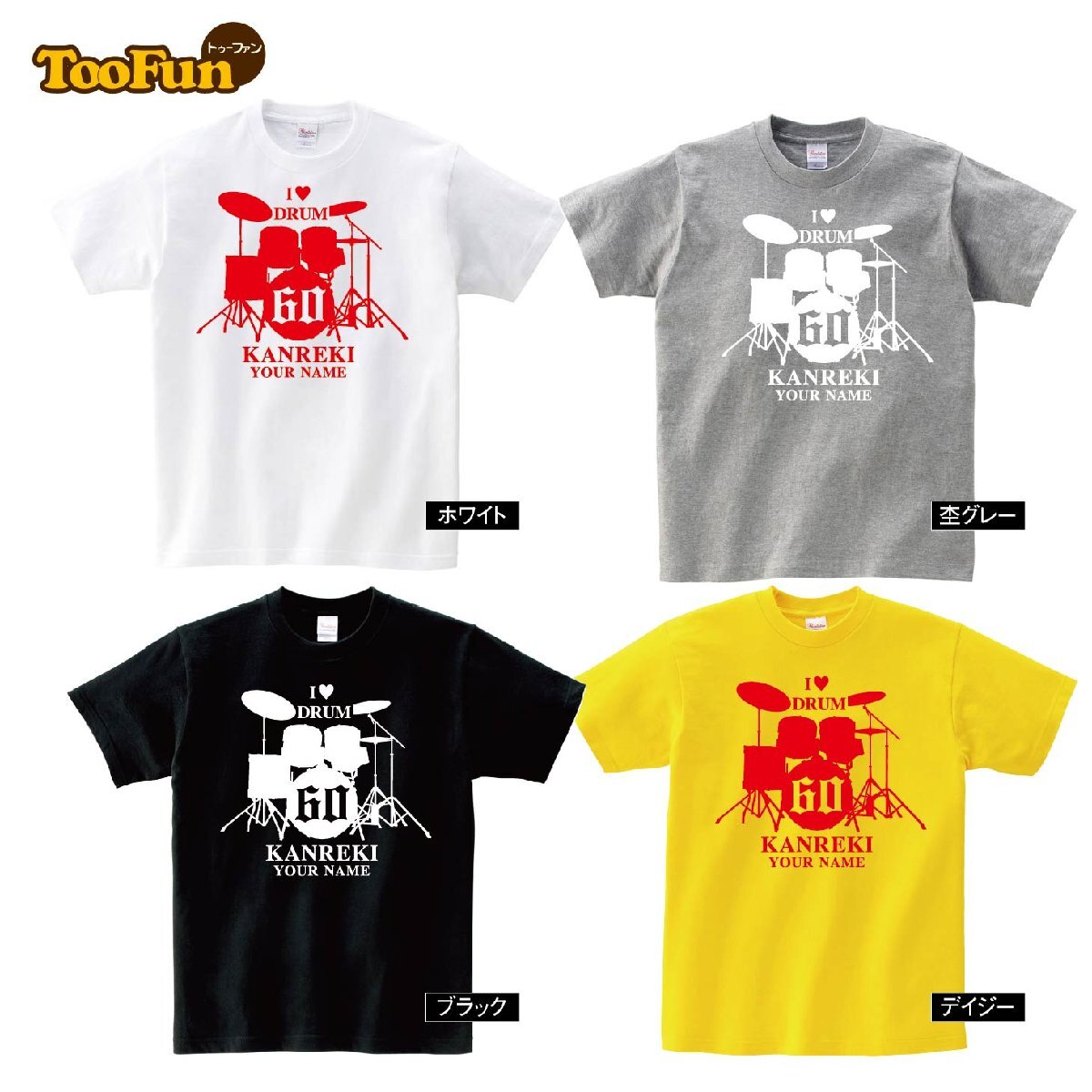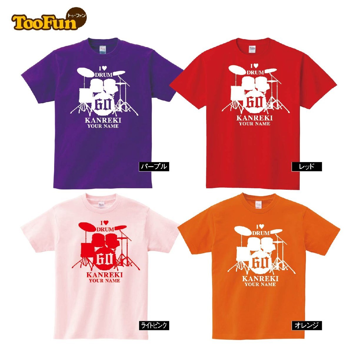 音楽、ドラム、バンドのシルエット、還暦のお祝いとして名入れができる半袖Tシャツです。お色が12色、サイズも15サイズとお子様から大人までお揃いでも着用ができる仕様です。
