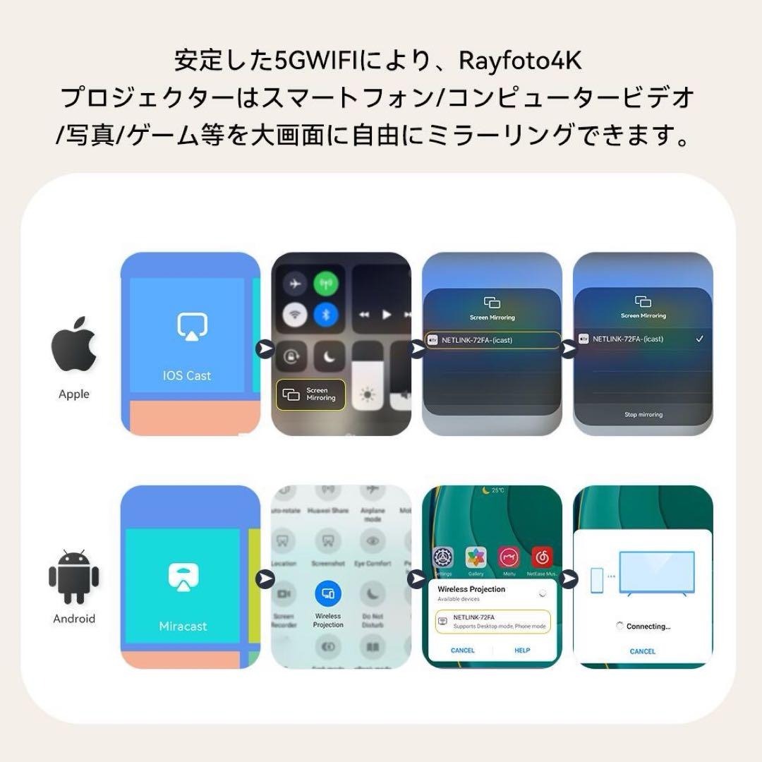 WiFiを経由してIOS、AndroidおよびWindowsデバイスと即時にワイヤレス接続可能!操作が楽ちん、大画面ビデオをご鑑賞頂けます。WI-FI環境がなくても無線ミラーリング・有線ミラーリング両方とも可、USBケープルで有線接続可能。そして、Bluetoothヘッドホン、イヤホンまたはスピーカー等とも接続可能。