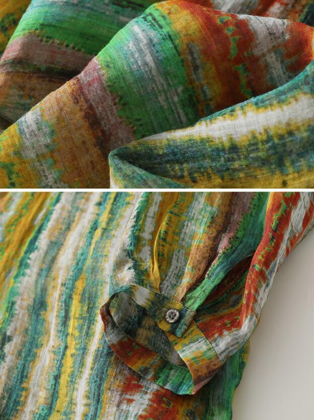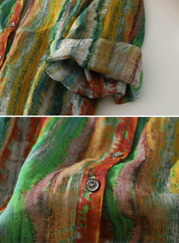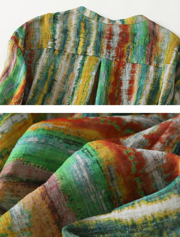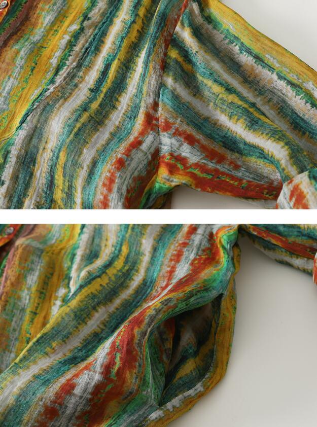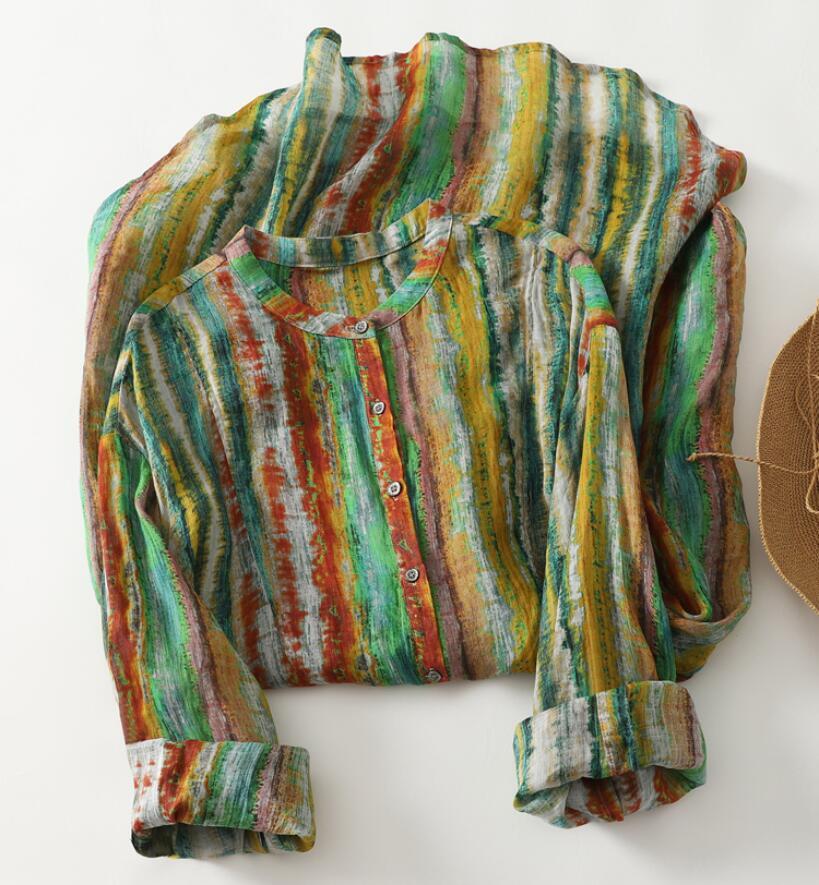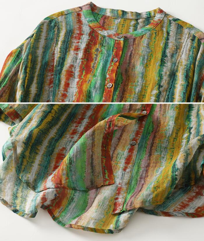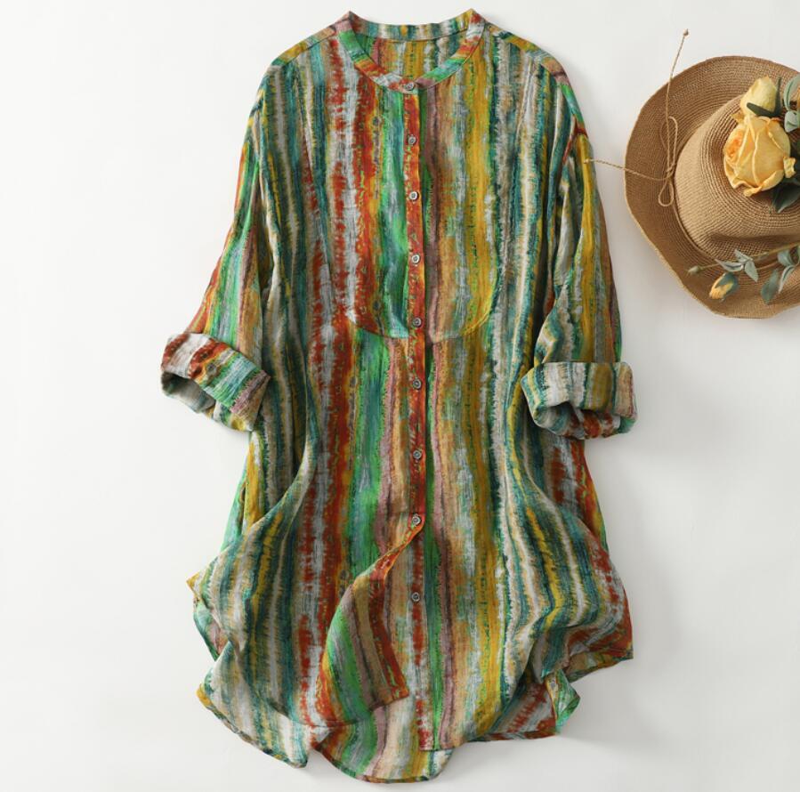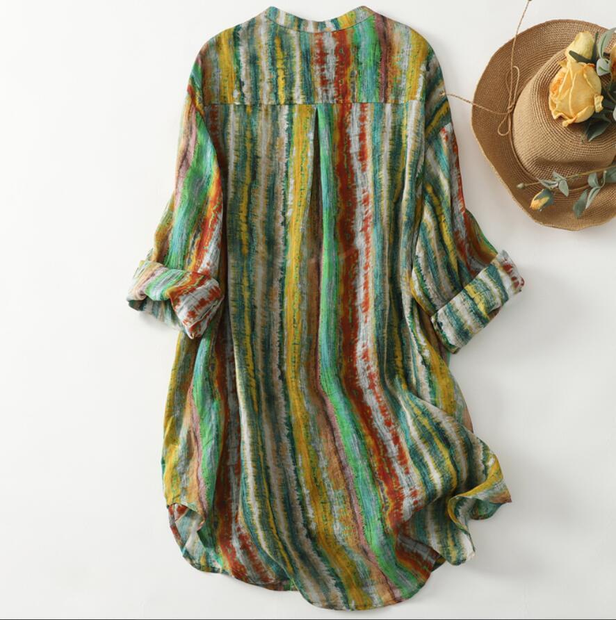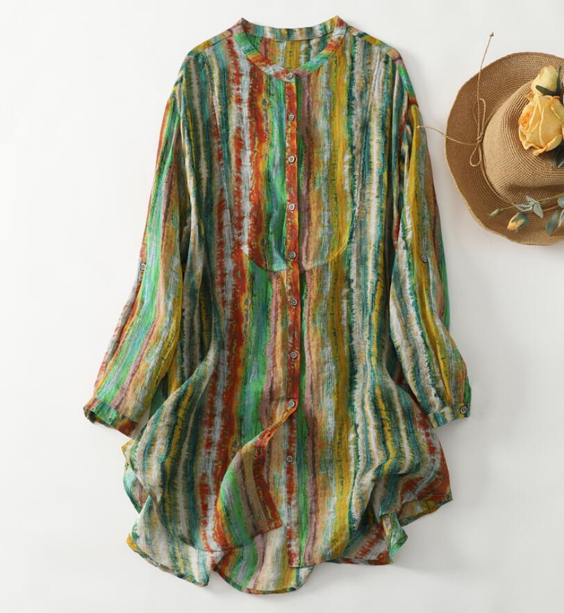 2025新品~ナチュラル ボーダー プリント柄 トップス 大人 レディース 大きいサイズ 通勤 オフィス チュニック 長袖 総柄 ロングシャツ~