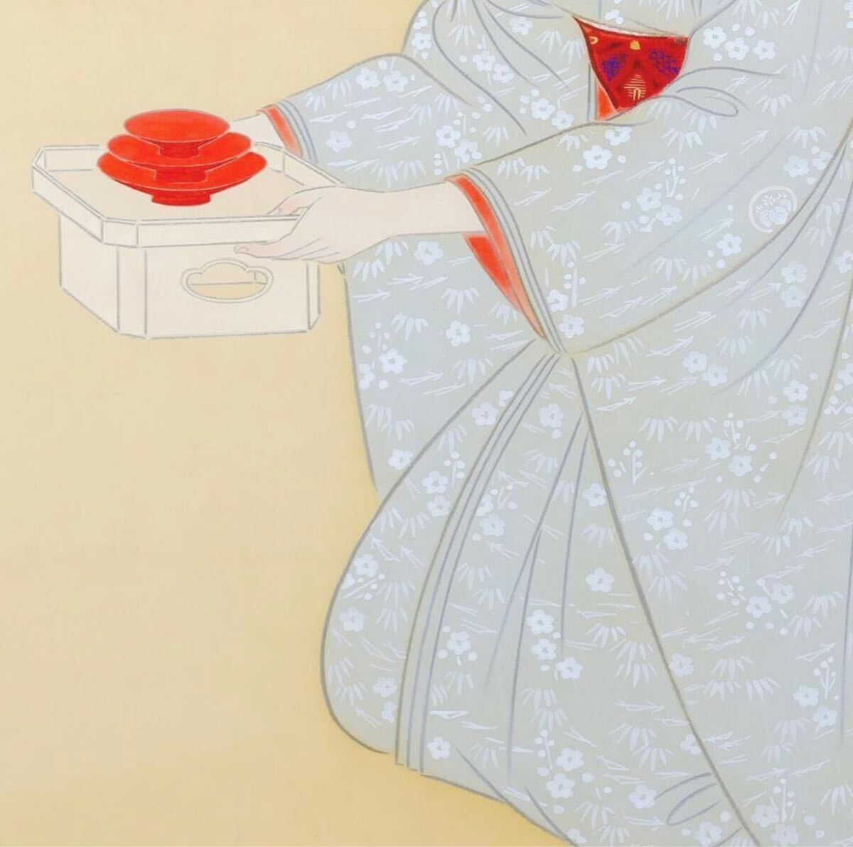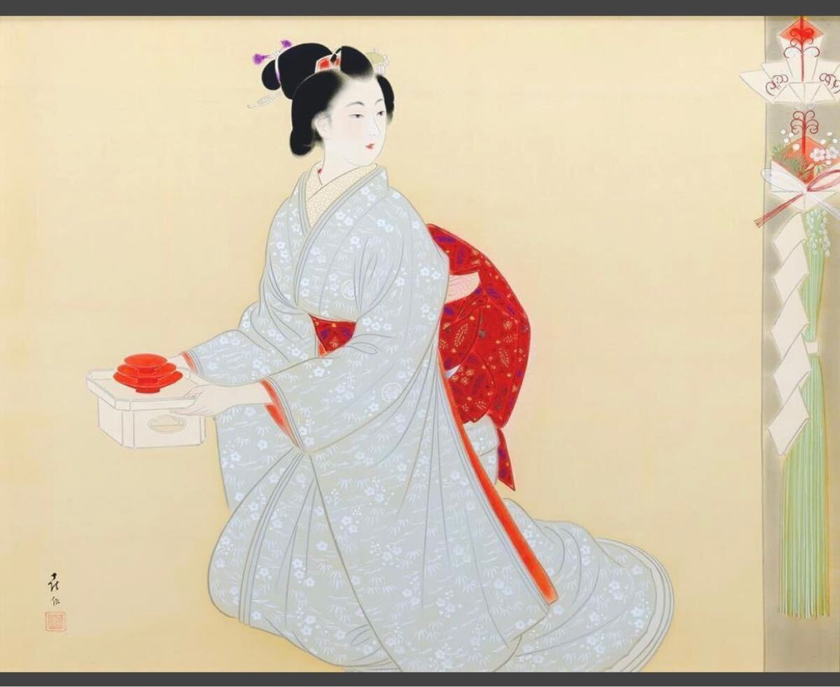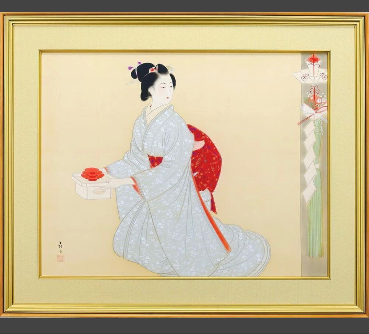 模写 山田喜作/美人画 額装絵になります。器を持つ美人と松飾り。冬向け(12月~3月あたり)の内容。サイズ的に展覧会やオーダーの注文品かと推測されます。非常に丁寧で上質な仕上がり。