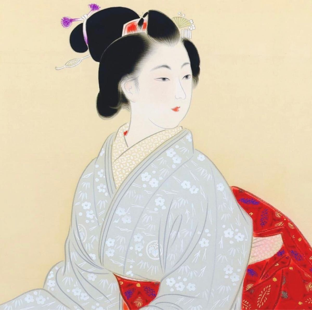 ・最後の写真4枚は参考写真です=美人画の図録「ジャパンビューティー 描かれた日本美人」に掲載の山田喜作の美人画作品のアップの写真です(図録表紙1枚/美人引き&アップ2枚/落款サインのアップ1枚)。