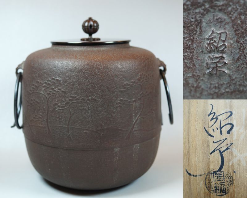 商品説明 | ■釜師 金森紹栄 浜松地紋 棗釜 松毬鐶付 唐銅梅摘の出品で御座います!!!■ ☆ 高さ 22.3cm 口径 10.6cm 胴径 20cm 重さ 2900g ◆旧家/茶道の先生よりお譲り頂きました! 多少古いお品物とご理解頂いた上での入札をお願いします。 経年の擦れ/汚れ等はご了承お願いいたします。 釜内部に多少の錆が見られます。