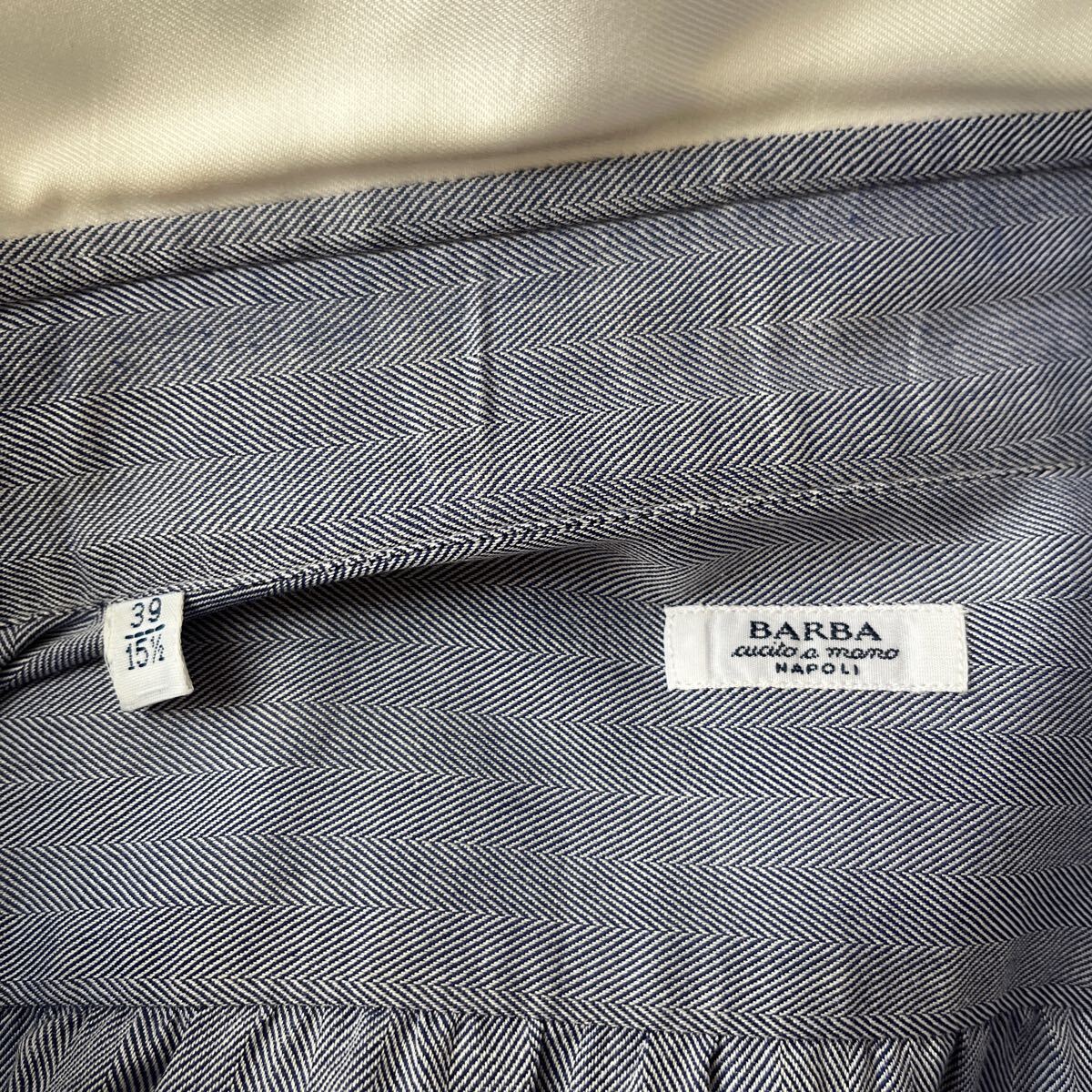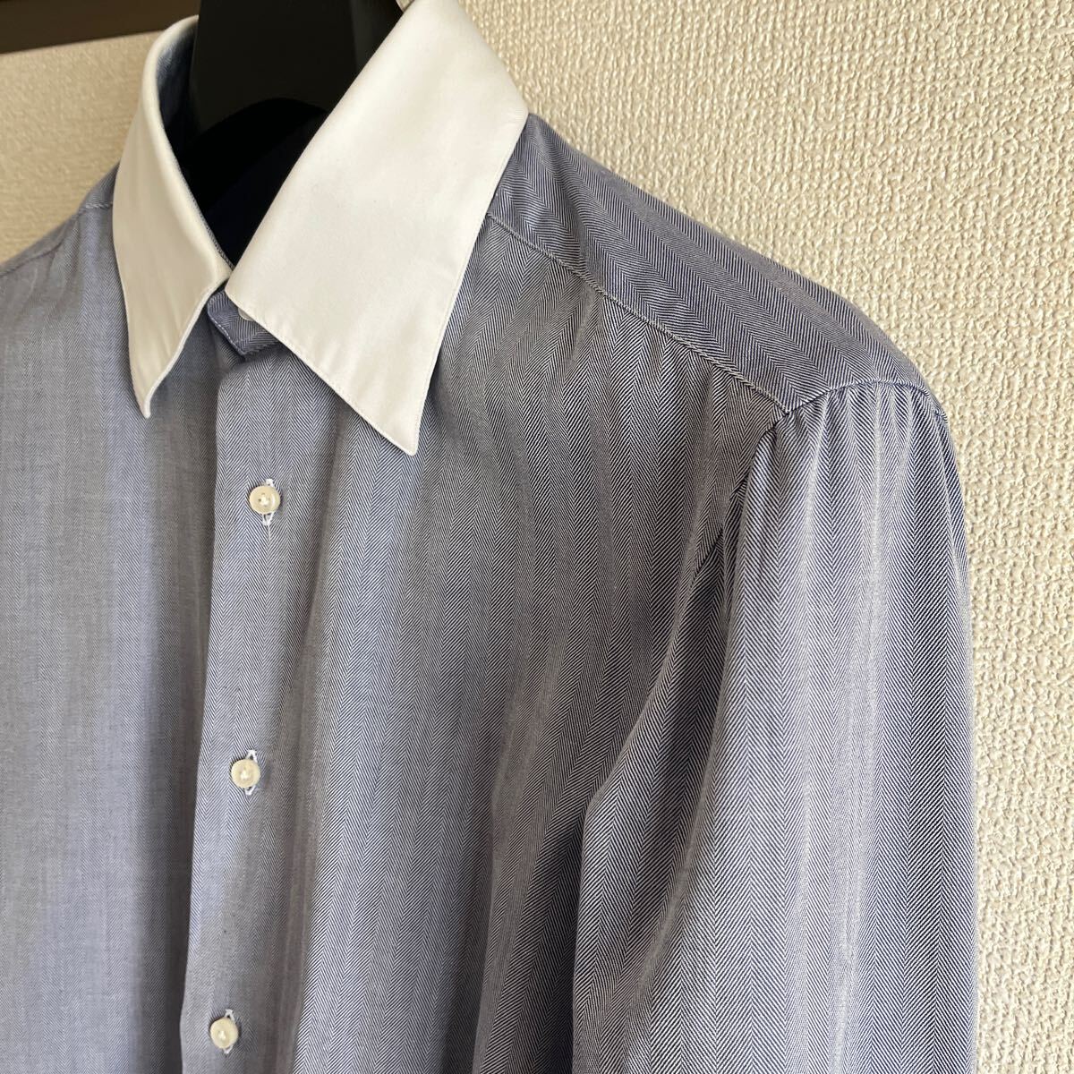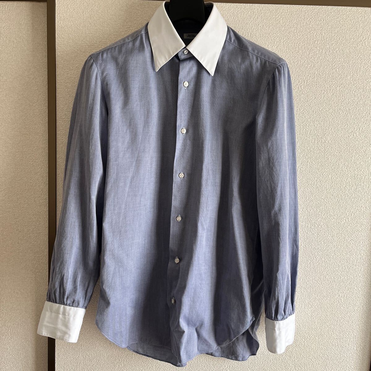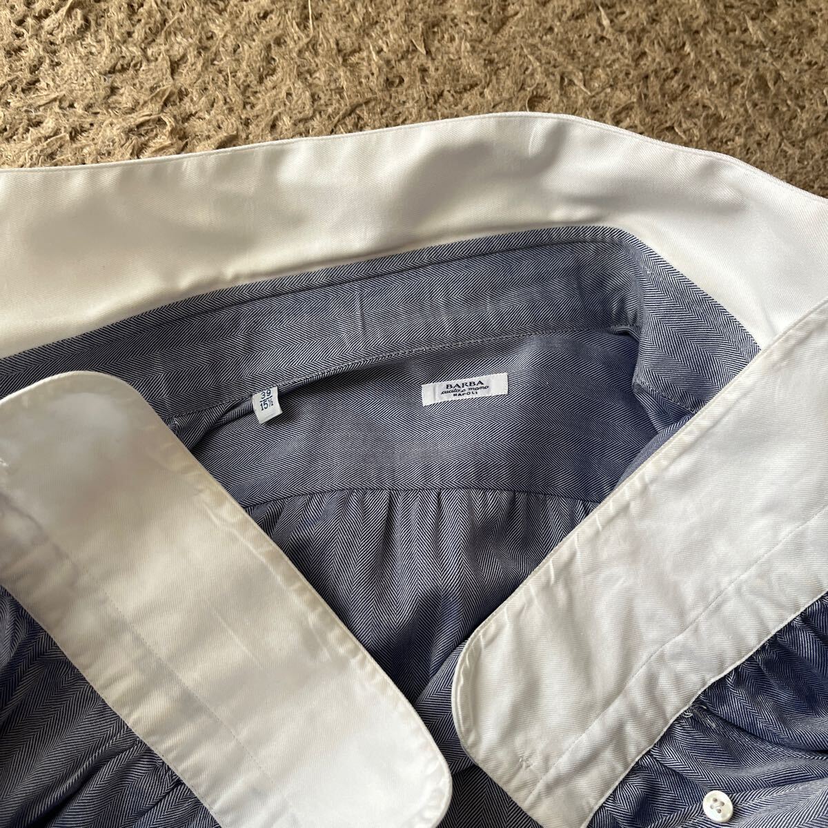 バルバのクレリックシャツです。定番のブルーホワイトです。レギュラーカラーなのでタイドアップをお勧めします。合わせを選ばないシャツです。