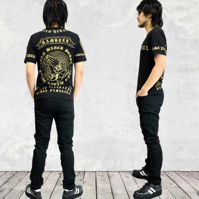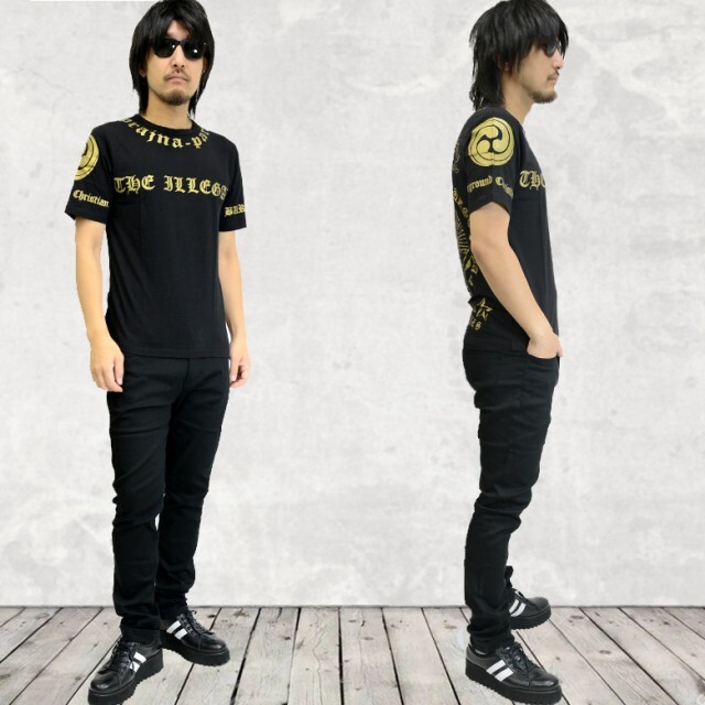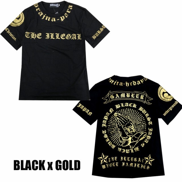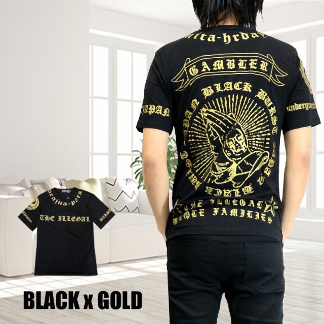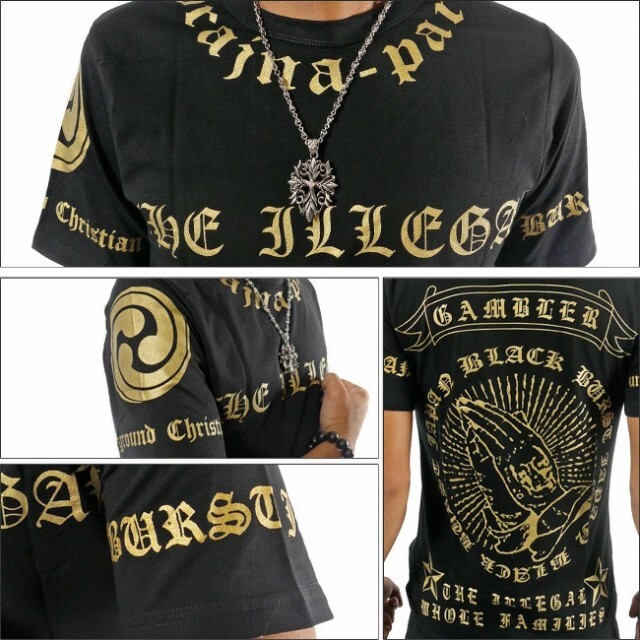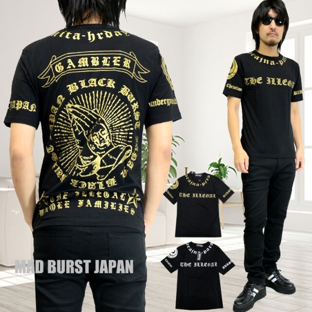 MAD BURST JAPAN イリーガル&三つ巴&スカルプレイハンド 合掌 プリント 半袖Tシャツ 70537  新品 ブラックゴールド M