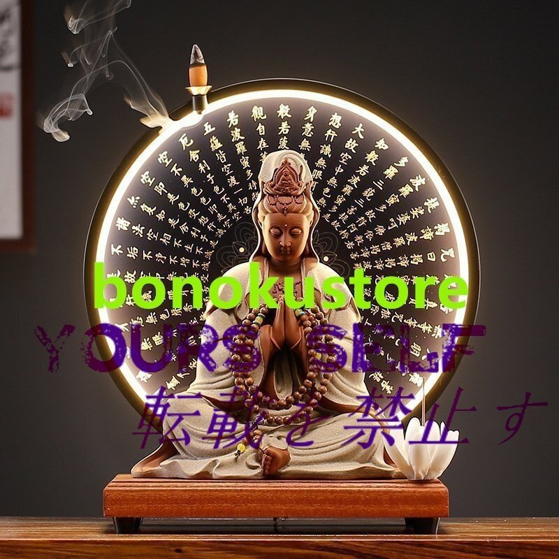 【ケーリーフショップ】観音像 仏像  仏教美品  経文 香立 台座付き LEDライト 禅の置物 逆流香 インテリア 装飾品  仏教美術