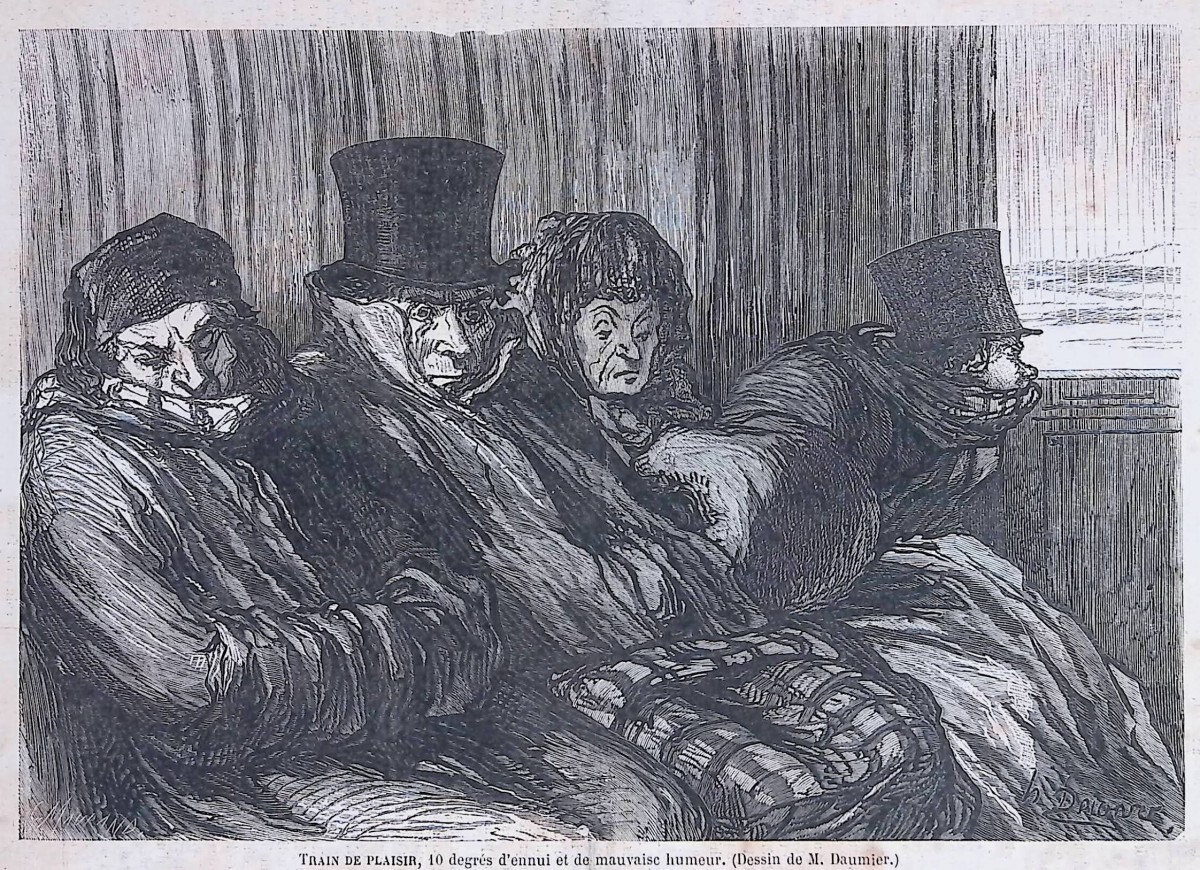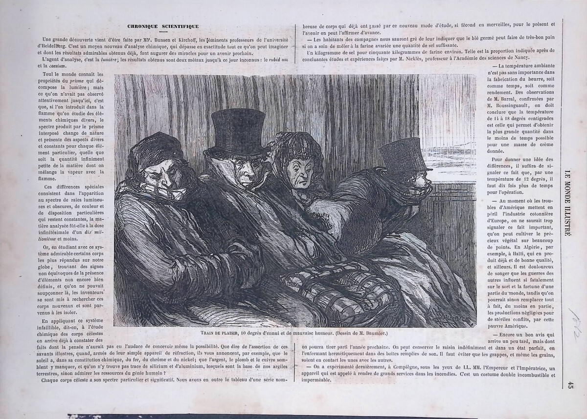 Honore Daumier の作品は、1960年代にパリで刊行される新聞に掲載されるようになります。これは、当時の新聞の一葉です。オリジナルの木口木版画です。 新聞紙のサイズは26cmx36.7cmです。その半分くらいの部分がドーミエの版画です。少し古色が出ていますが、状態は良いと思います。版上にサインがあります。ドーミエの版画のうち、新聞に掲載されたものは、殆ど残っていません。非常に珍しいものです。
