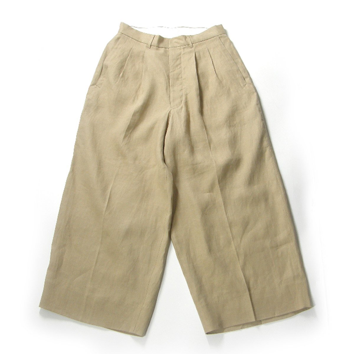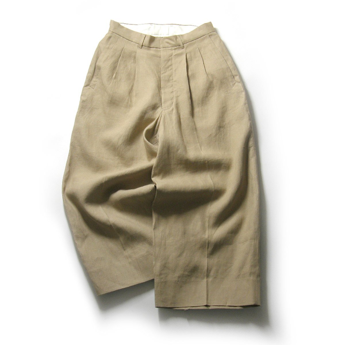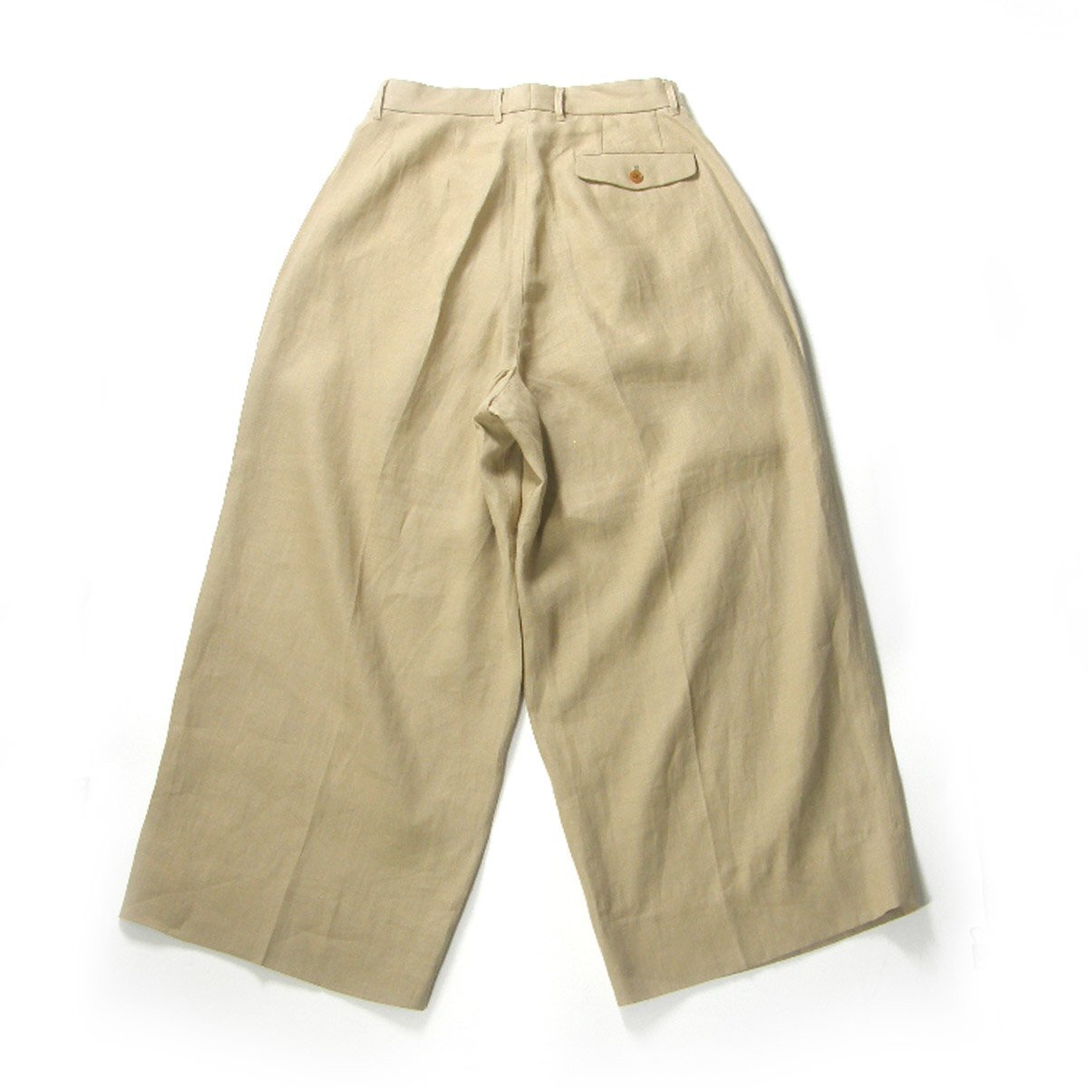 素材は強度のあるヘンプ素材をワイドシルエットのドレープを生かせるよう、出来る限り柔らかくナチュラルに仕上がり。