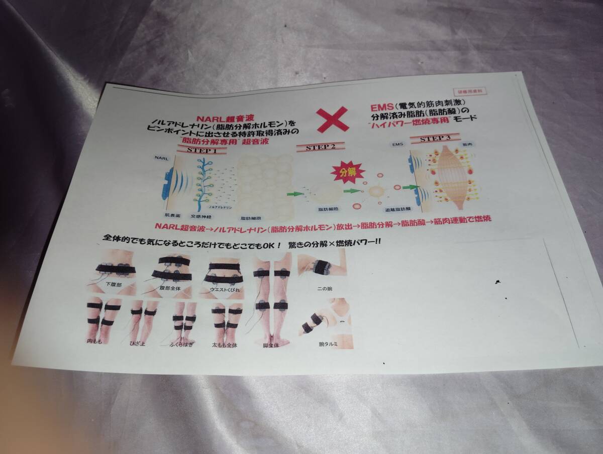 脂肪を燃焼しやすくする「NARL超音波」と高い運動効果を発揮する「EMS(イーエムエス)機能」が融合した今までに無いダイエットマシンです。自社特許技術の「NARL超音波」により分解された脂肪を、独自のEMSプログラムで効率よく燃焼させます。またEMS&NARLを同時に出力させる新パッドを採用、都度張り替える手間なく短時間でのダイエット効果を実現します。