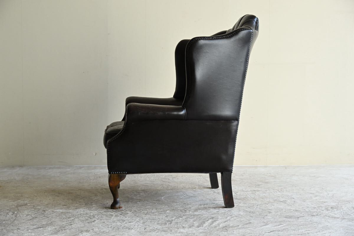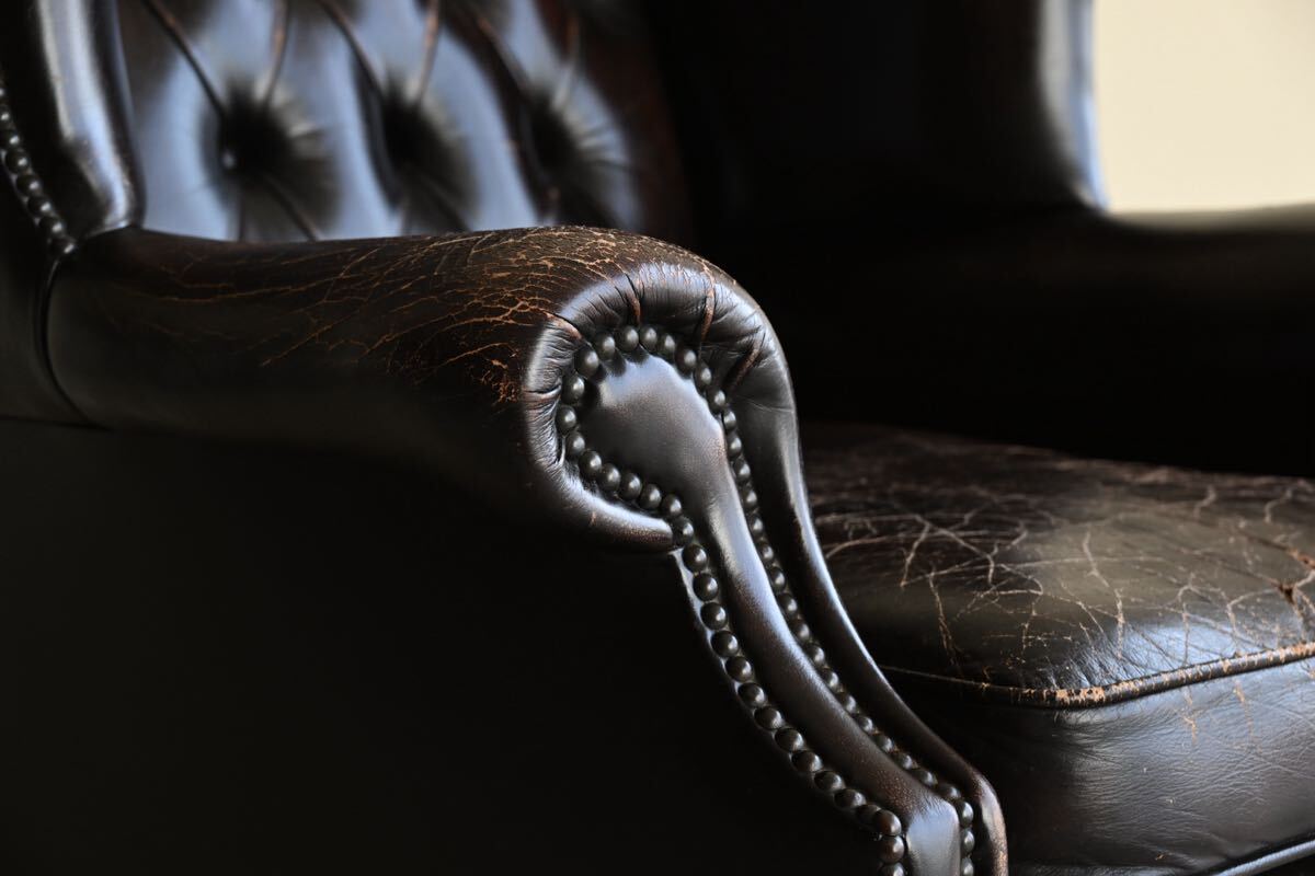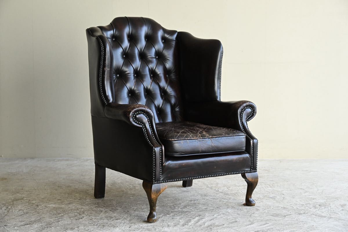 ヴィクトリアン・スタイル ウィングバックチェア 《ヴィクトリアン・スタイル ウィングバックチェア — 鋲打ち革張りの静謐》A Study in Leather, Silence, and Time19世紀英国に端を発する“ウィングバックチェア”は、かつて暖炉の側に置かれ、貴族や学者の読書と沈思の場を支えた椅子です。本作は、その伝統を色濃く受け継ぐ逸品であり、現代においてなお孤高の存在感を放ちます。 張地には、上質なフルグレインレザーを用い、時の経過とともに自然に浮かび上がったクラック(皺)や色褪せが、人工では再現し得ない真のパティーナを形成。触れるたびに、時代の手触りを伝えてくれます。 背面には、英国チェスターフィールド様式を象徴するディープボタン・タフティング。ボタン締めにより生まれる規則正しい陰影が、荘厳で格式ある印象を与え、椅子でありながら彫刻のような立体感を生み出しています。 アーム部から脚部にかけては、熟練の鋲打ち職人による装飾が施され、フレームはカブリオールレッグ(猫脚)を採用。これは18世紀のフランス・ロココ様式からインスピレーションを得たものであり、力強さと優美さを兼ね備えたシルエットが特徴です。 背面に至るまで一切の妥協なく仕上げられたレザーは、空間に置かれることで静かな緊張感を生み出し、その場の「格」を一段階引き上げる力を有します。椅子としての機能性を超えた、空間の重心としての存在。 【仕様概要】